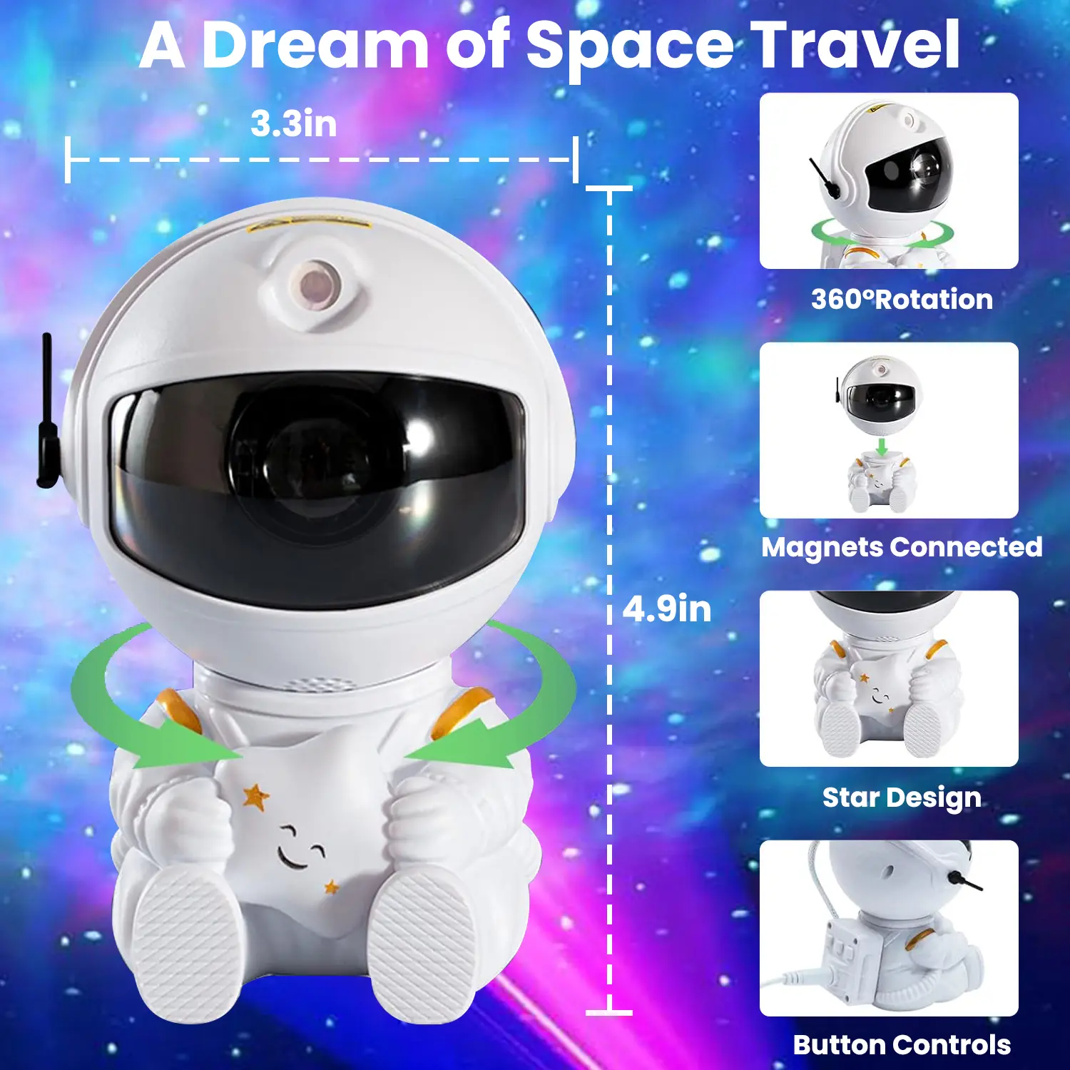 ăBedroom DecorationăThis star projection lamp has a novel and unique appearance, featuring an astronaut design that echoes the theme of the galaxy. It is a must-have item for space enthusiasts. The astronaut holds the stars, looking adorable like a child. It is not only a night light projector but also a cute and beautiful decoration, which can be used to decorate your room, bedroom, and desk!