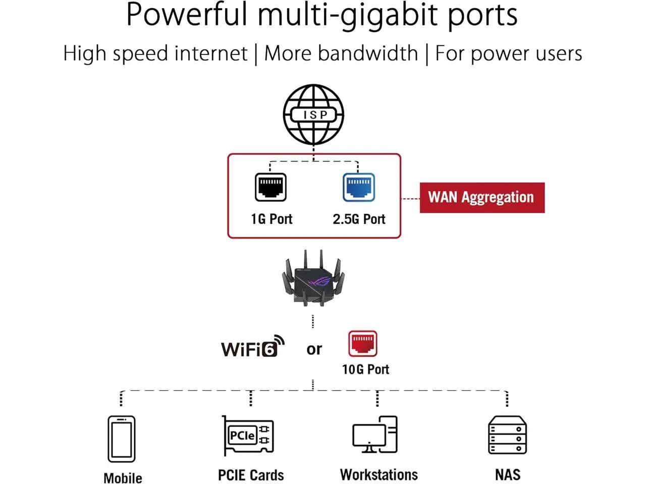 The GT-AX11000 Pro has one 2.5 Gbps port and one 10 Gbps port that can be configured for either WAN or LAN operation. It also supports link aggregation and load balancing for massive bandwidth.