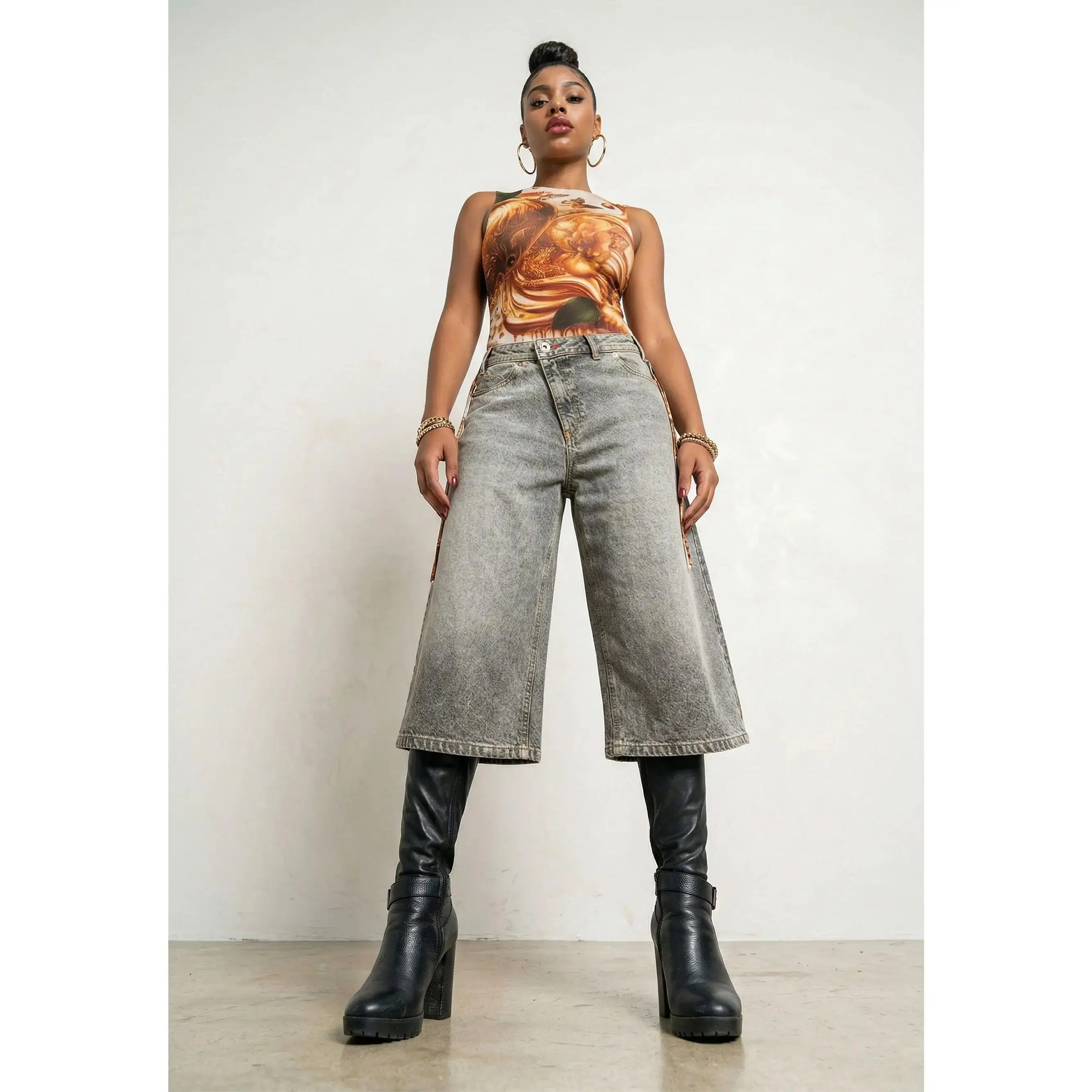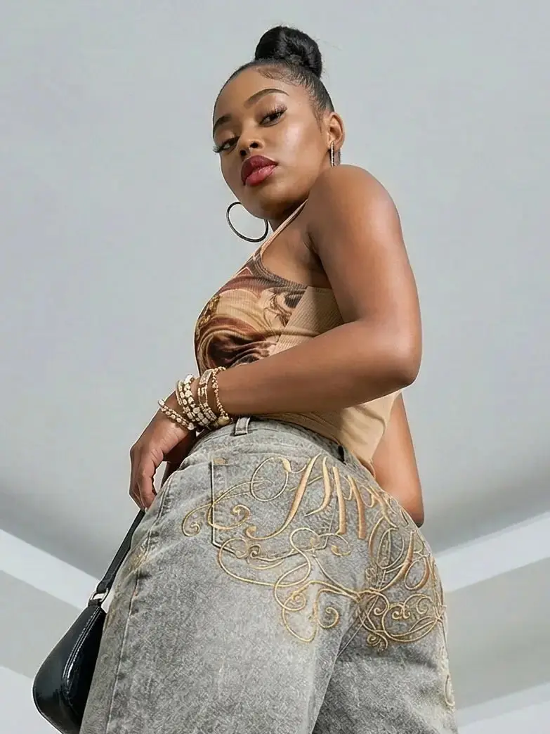 A fresh twist on denim. The Asymmetric Wide Leg Jorts feature a bold asymmetric zip closure and a relaxed wide leg fit that hits below the knee for an effortless statement silhouette. Designed with gold hardware, an Apple coin pocket, and signature embellished embroidery across the back, this pair blends standout details with everyday wearability.