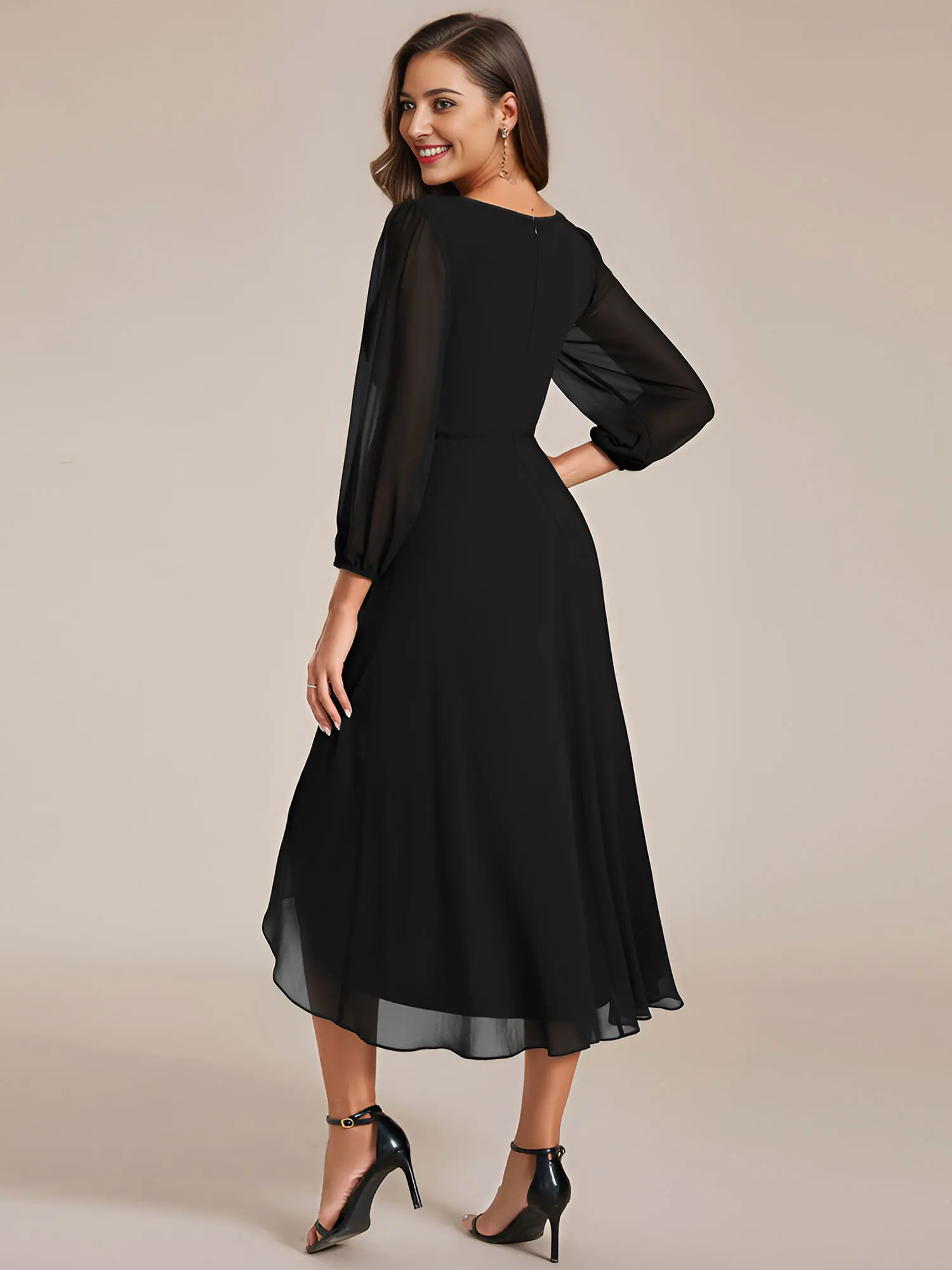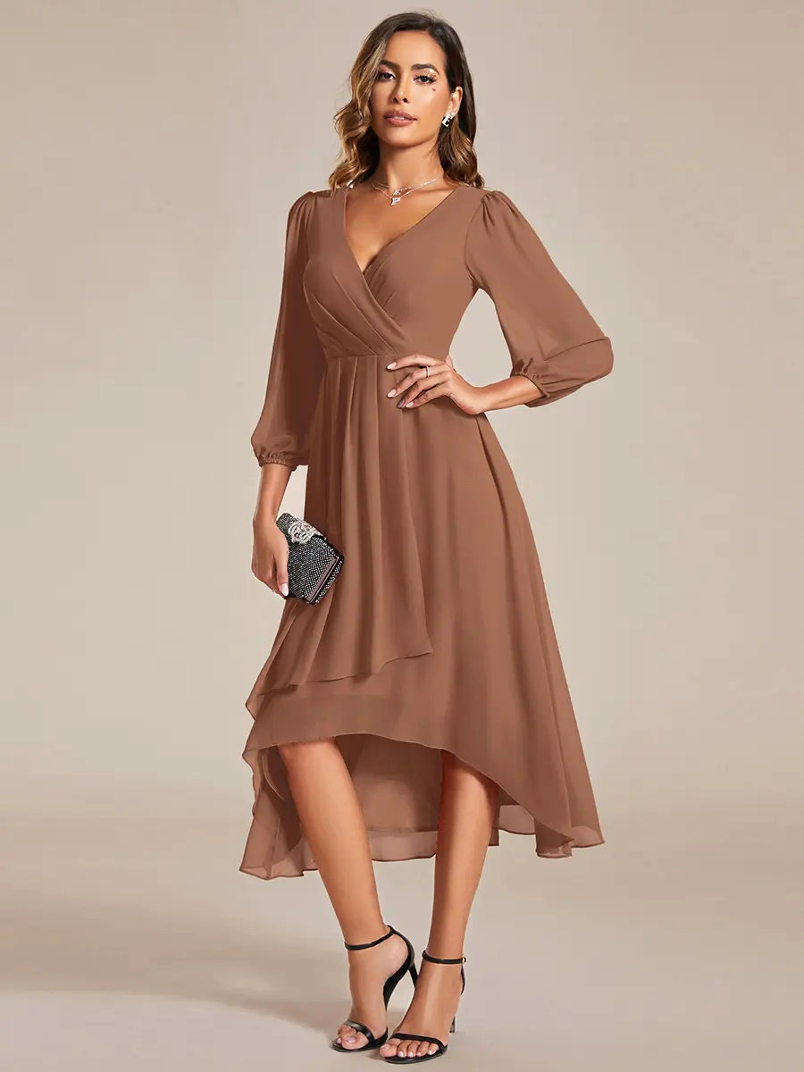 Elevate your wedding guest look with the Ever-Pretty Long Sleeves Asymmetrical Hem A-Line Midi Dress. This dress features a sophisticated long sleeves design and an asymmetrical hem, perfect for standing out at any wedding.