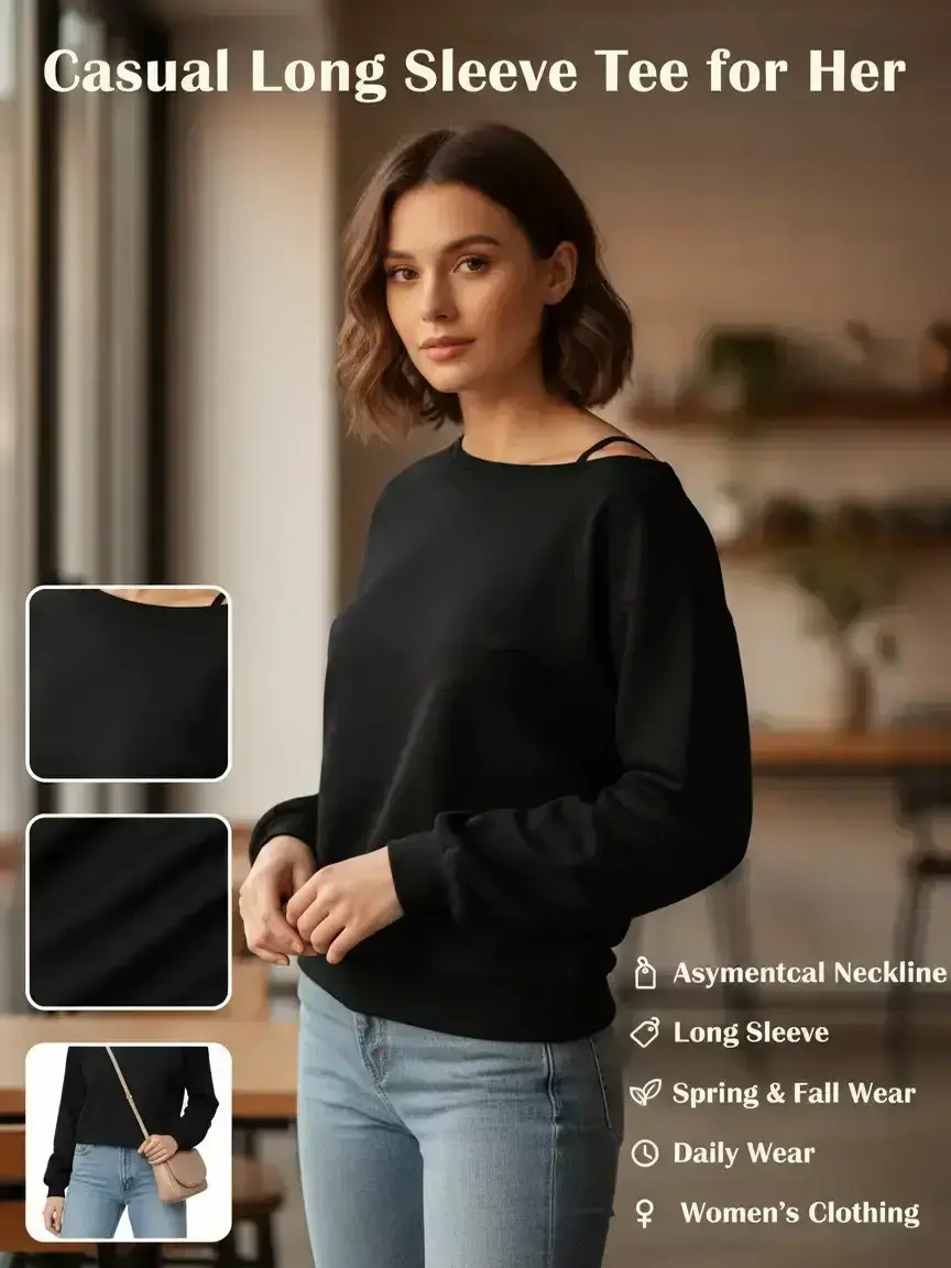 I absolutely love this asymmetrical neck tee! The fit is flattering without being too tight, and the off-shoulder design gives it a stylish, slightly edgy look while still being casual enough for everyday wear. The fabric is soft, comfortable, and lightweight. It pairs easily with jeans or leggings.