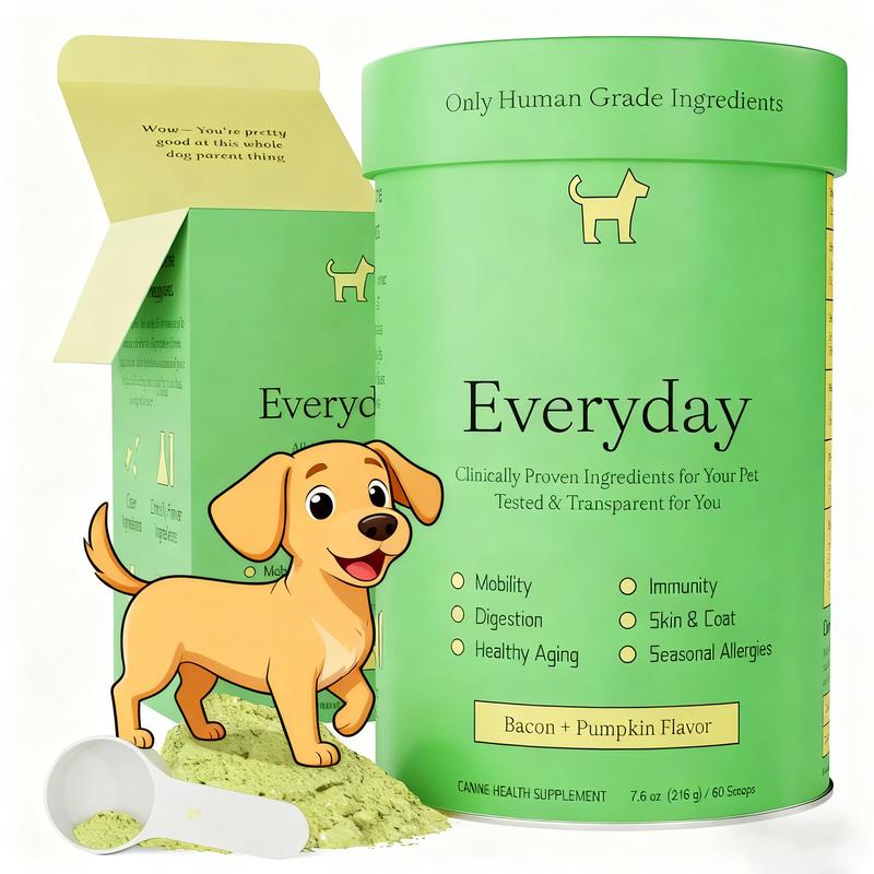This multivitamin supports your dog's health with 45 active ingredients. It focuses on hip & joint, gut, immune, and skin/seasonal allergy support. Each pack contains 60 scoops in a bacon pumpkin flavor. Infused with probiotics, it's a natural choice for dog supplies. Perfect for everyday use, this supplement ensures your pet stays healthy.