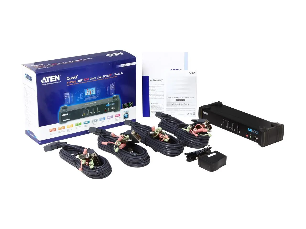 MAIN OVERVIEW FEATURES: Number of Computers Supported: 4 Maximum Video Resolution: 2560 x 1600 USB: Yes DVI: Yes Number of USB Ports: 8 Number of DVI Ports: 5 Height: 2.2" Width: 10.6" Depth :3.4" Weight (Approximate):2.05 lb Package Contents: CubiQ CS1784A KVM Switch 4 x Custom DVI-D KVM Cable Sets 1 x Power Adapter 1 x User Manual 1x Quick Start Guide Environmentally Friendly :Yes Environmental Certification :RoHS, WEEE