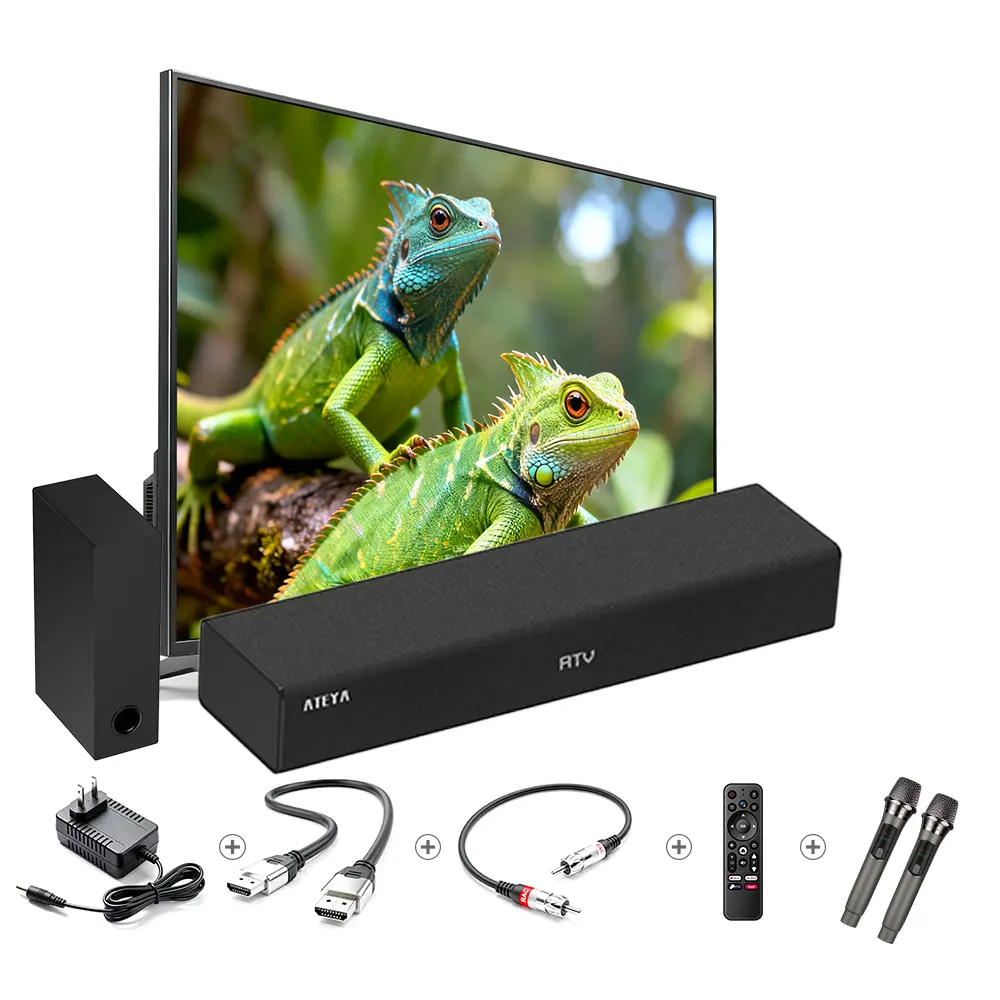 Upgrade your TV experience with the ATEYA Smart Android TV Sound Bar. This Magic Soundbar features an Android system, delivering 4K HDR and deep bass subwoofer. Enjoy free access to music and movies, enhancing your entertainment. The wireless Bluetooth connectivity and karaoke mic add versatility. Setup is a breeze, making it perfect for indoor use. Ideal for smart TV owners, it includes a digital TV antenna for optimal performance.