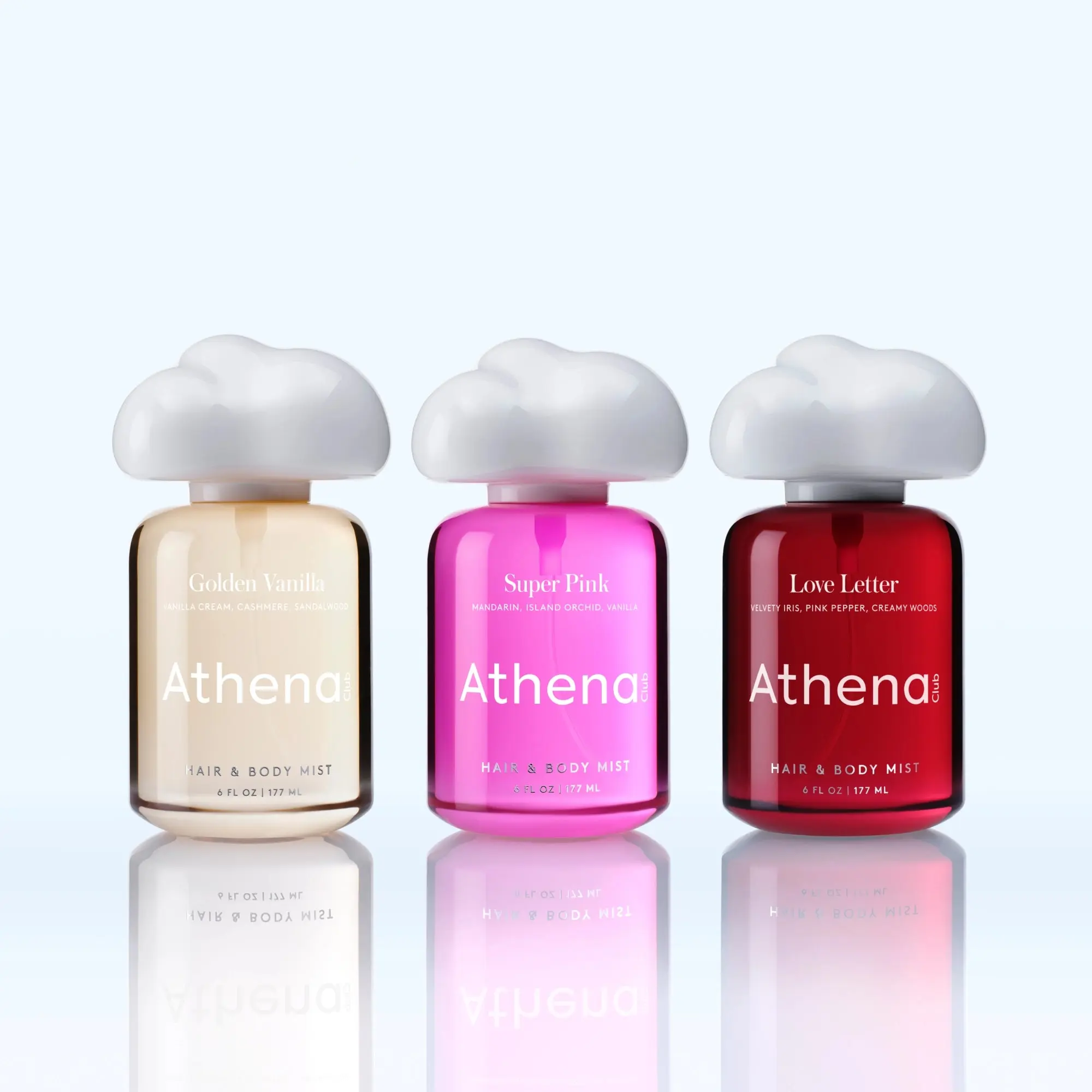 That on-cloud-nine feeling, bottled. This set features three full-sized Hair & Body Mists, each in a different Athena Club fragrance meant to complement one another. Crafted with 5% fine fragrance oil—nearly double the industry standard—this hair and body mist delivers a luxurious scent experience that lasts. Each spray is designed to be layered and built upon, so you can create your own evolving fragrance wardrobe.