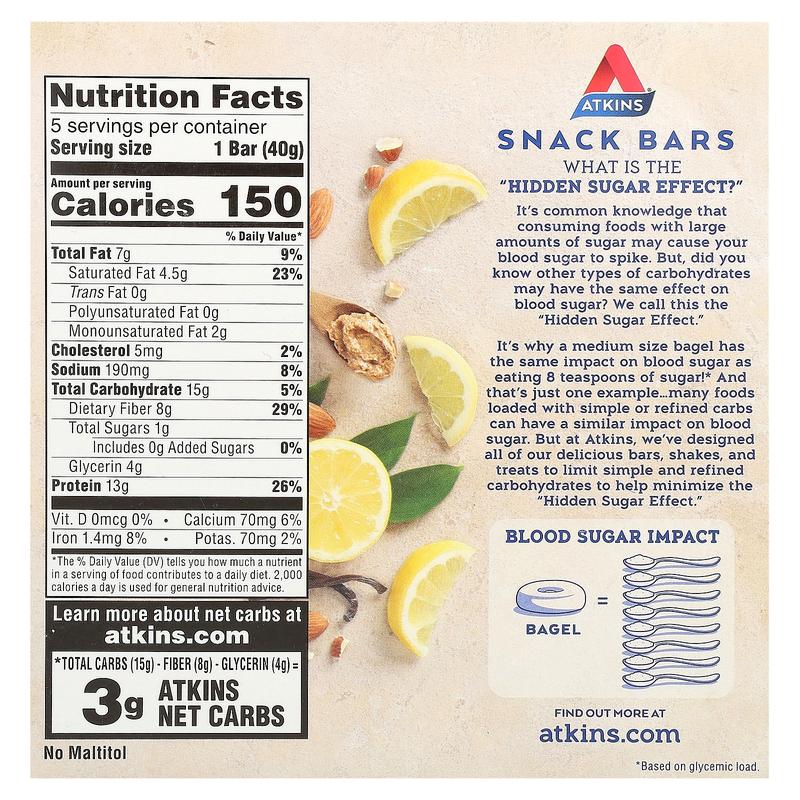 Atkins Snack, Lemon Bar, 5 Bars, 1.41 oz (40 g) Each