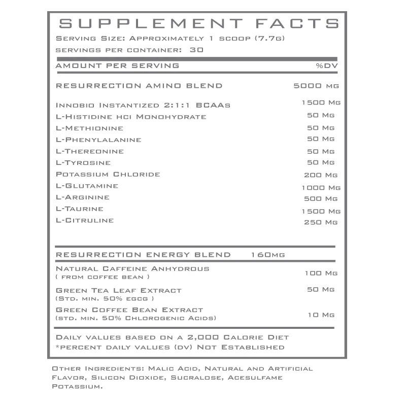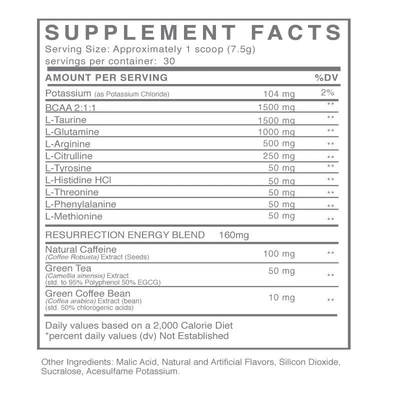 BCAA 2:1:1,L-Taurine,L-Glutamine,L-Arginine,L-Citrulline,L-Tyrosine,L-Histidine HCI,L-Threonine,L-Phenylalanine,L-Methionine,Resurrection Energy Blend,Malic Acid,Natural and Artifical Flavors,Silicon Dioxide,Sucralose,Acesulfame Potassium