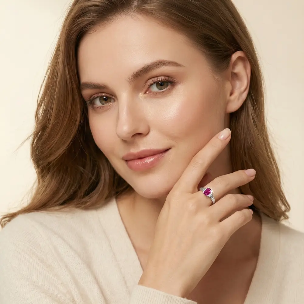 This exquisite ring features a lab-created ruby moissanite, set in a S925 sterling silver band. Perfect for women seeking a touch of luxury, it's ideal for birthdays, parties, and special occasions. The R334 model offers a blend of elegance and sophistication.