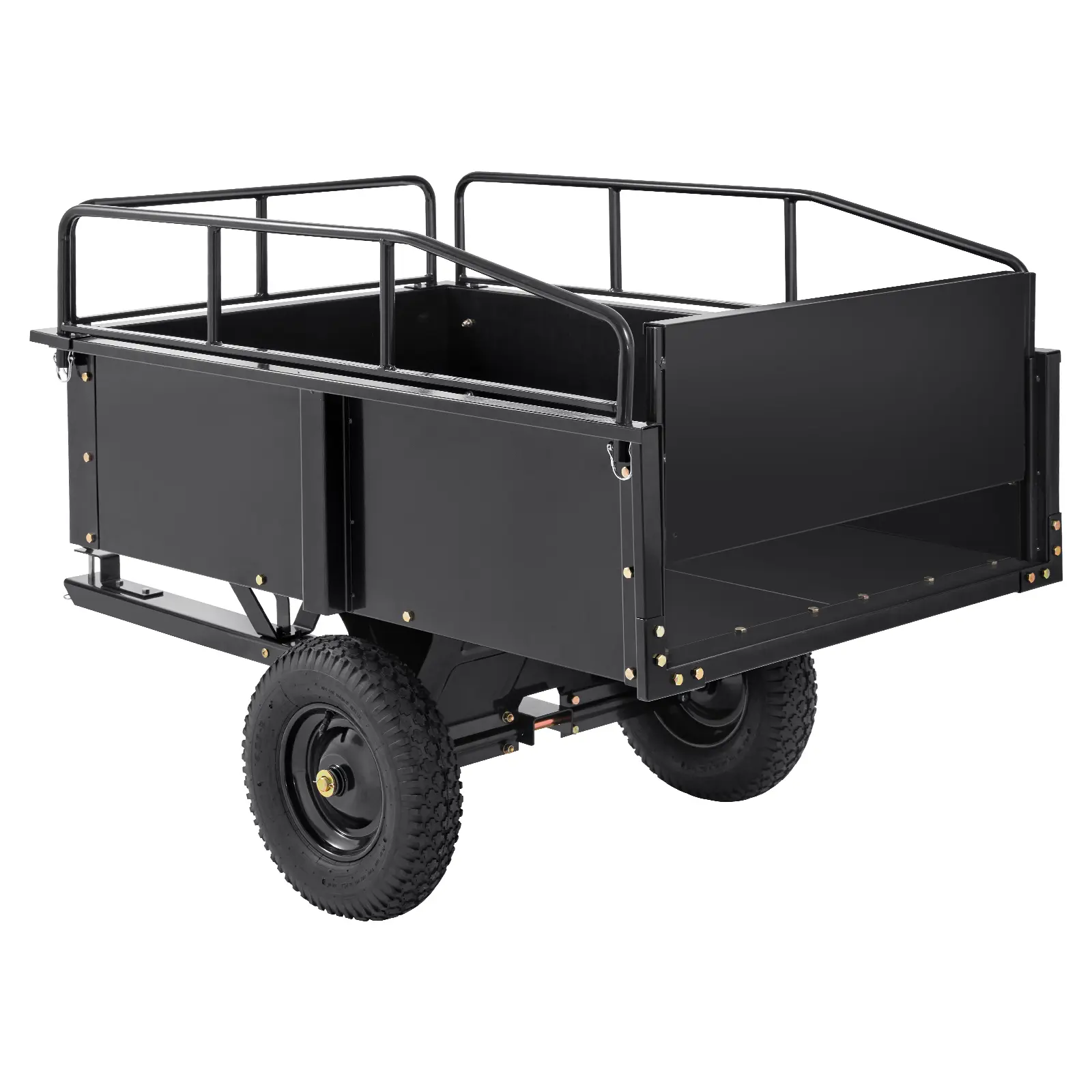 • High Capacity Trailer: Our ATV dump cart has added railings on three sides and can hold 15 cubic feet of yard waste. Collect more wood, soil, or garbage at once, reducing the need for frequent trips. Handle your yard work in one fell swoop with our high-capacity trailer.