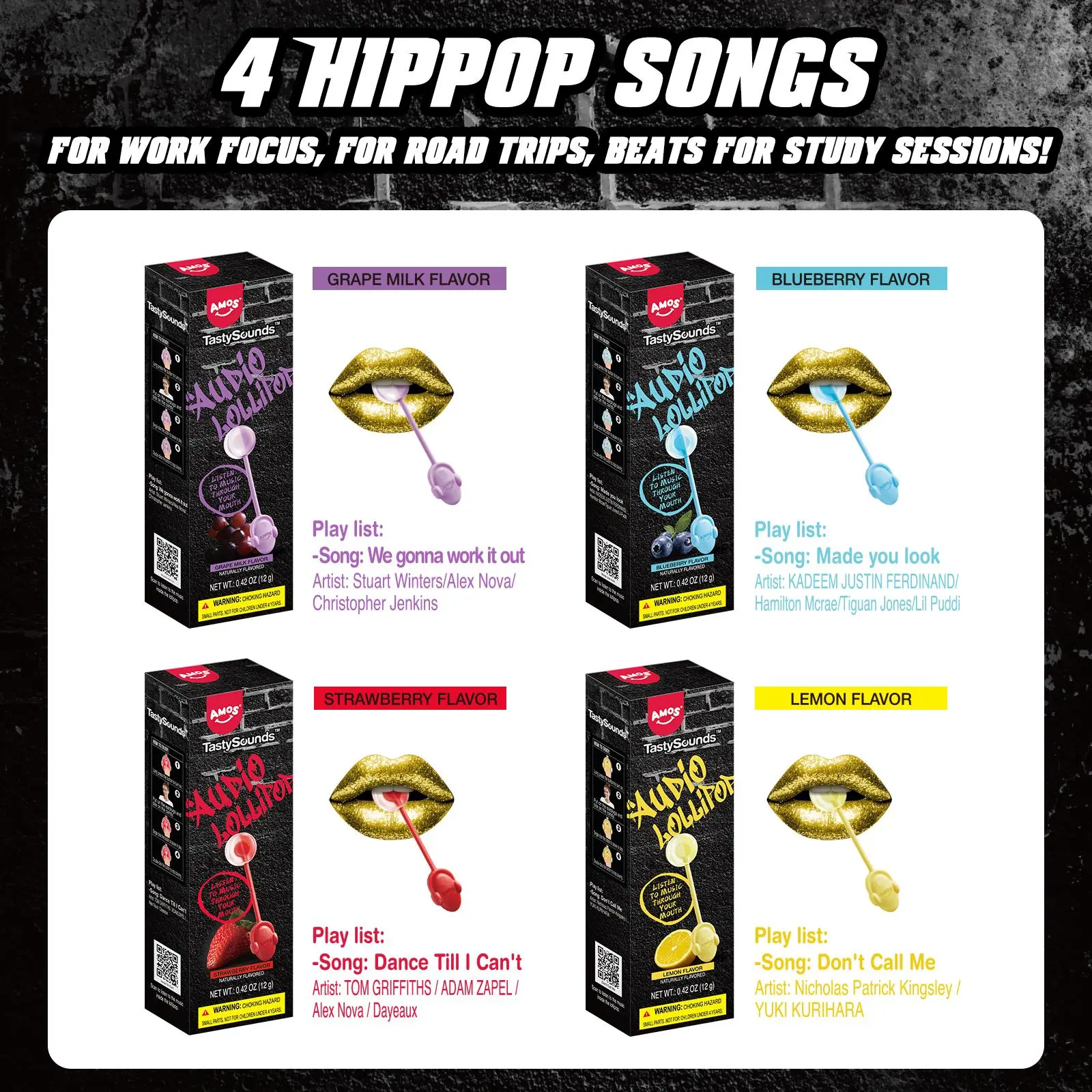 ·4 Flavors, 4 Hip-Hop TracksGrape Milk, Blueberry, Strawberry, and LemonEach flavor activates a different beat, turning every lollipop into a mini music experience