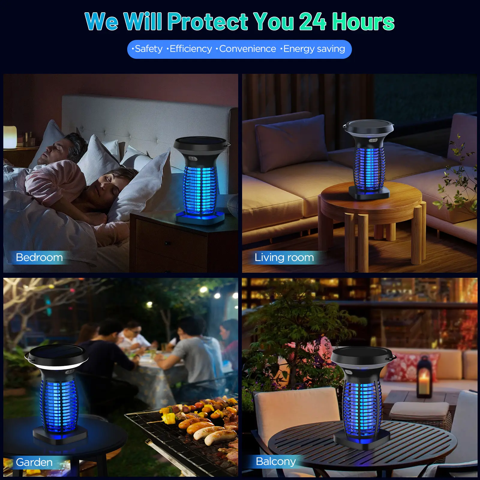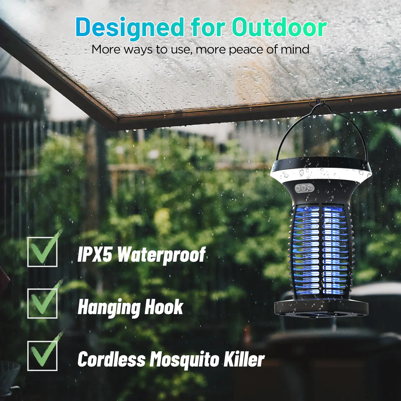 ·Extended Battery Life: Our solar bug zapper outdoor is equipped with a durable battery that ensures long-lasting performance and can withstand multiple charges. The LED light functions for up to 10 hours, while the insect killer lamp operates for up to 9 hours. This design effectively keeps your home mosquito-free for extended periods, reducing the need for frequent recharging. Additionally, its IP44 waterproof rating makes the bug zapper light ideal for outdoor use.
