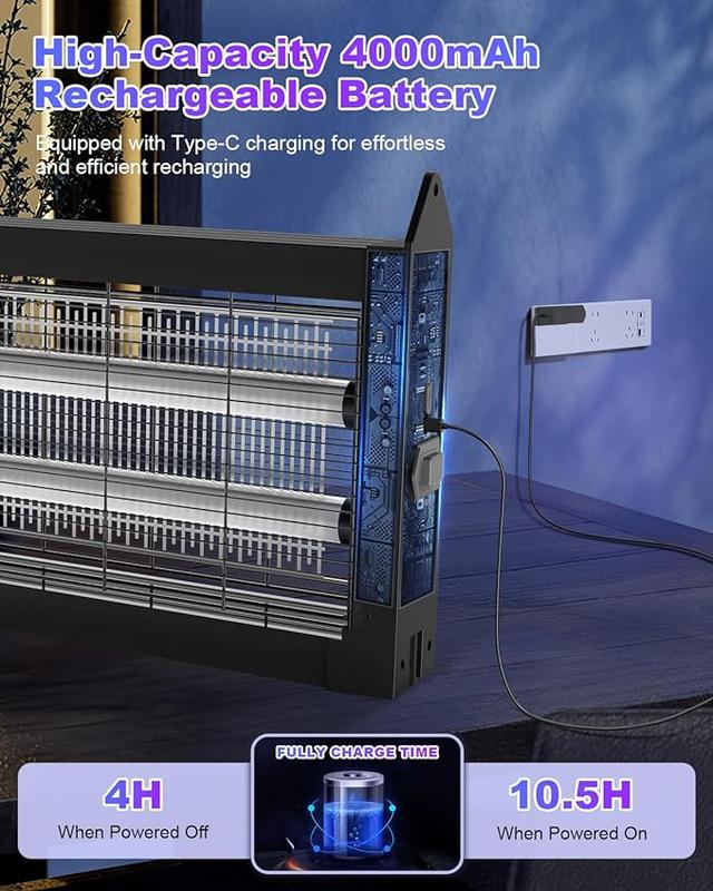 ·【Long-Lasting Battery】Featuring a robust battery, efficient solar panels, and a potent rechargeable battery, the bug zapper indoor provides up to 12 hours of uninterrupted defense after a full charge. Solar charging takes approximately 10 hours (depending on light intensity), while USB charging requires only 4 hours. For optimal performance during solar charging, simply activate the 'AUTO' mode.