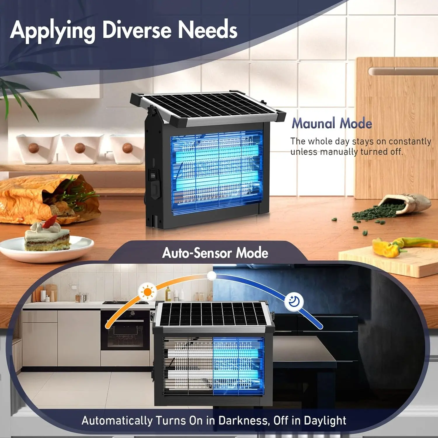 Smart Dual-Mode Operation – Manual Mode allows the mosquito killer to deliver 24/7 intelligent protection, ensuring mosquitoes are solved whenever needed. In Auto Mode, the mosquito zapper outdoor auto sleeps during solar charging and auto-on when charging ceases - Increasing energy-saving efficiency by 40%
