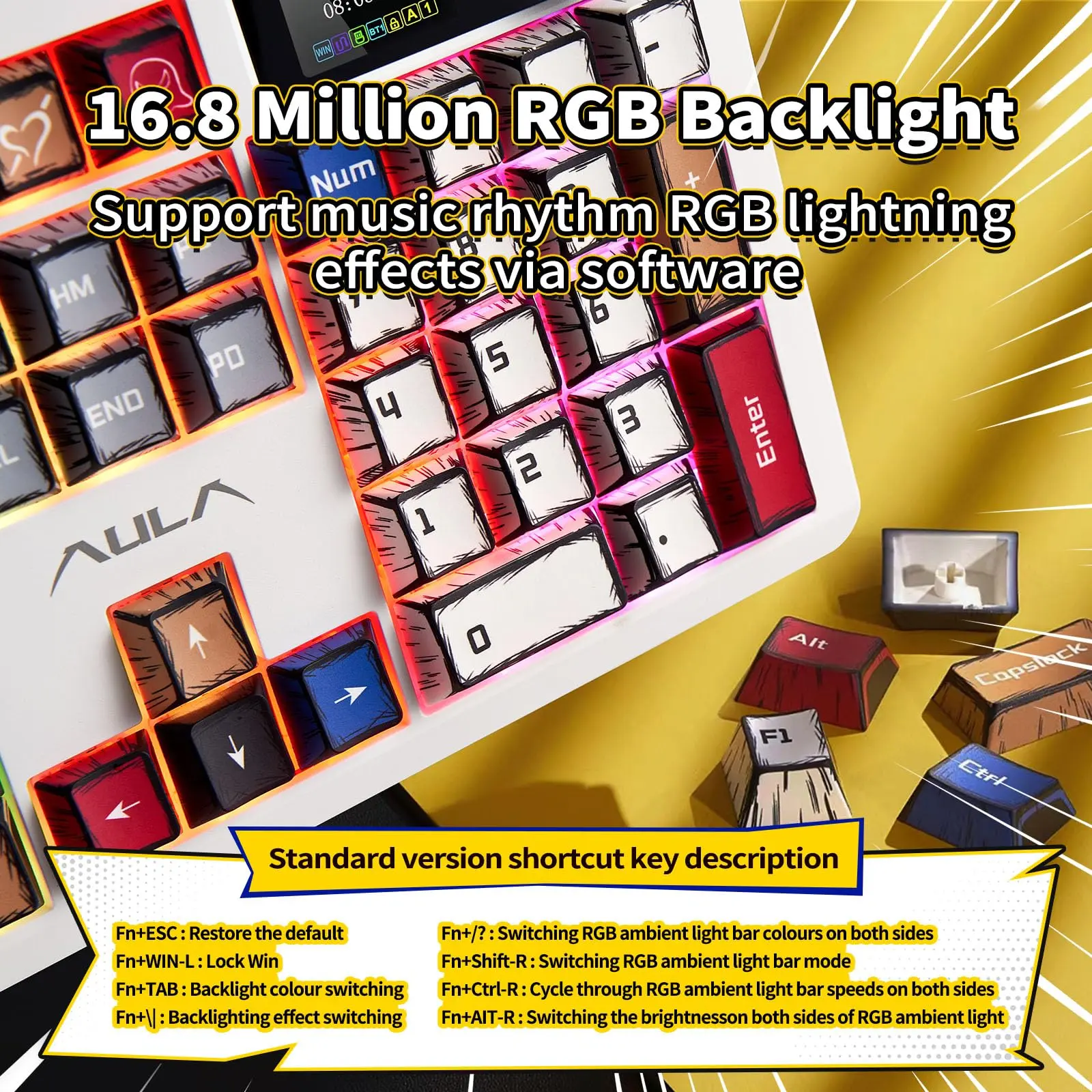 ·Original PBT keycaps: The Aula F106pro mechanical keyboard wear-resistant and oil-resistant: high-quality PBT keycaps are made of high-quality PBT material, and are formed in one by two-color injection molding. The characters are clear and wear-resistant, and will not cause oil or fading after long-term use. The surface of the keycap has a delicate matte texture, which makes it comfortable to touch and not slip easily, and can keep your fingertips refreshed even after a long period of tapping.