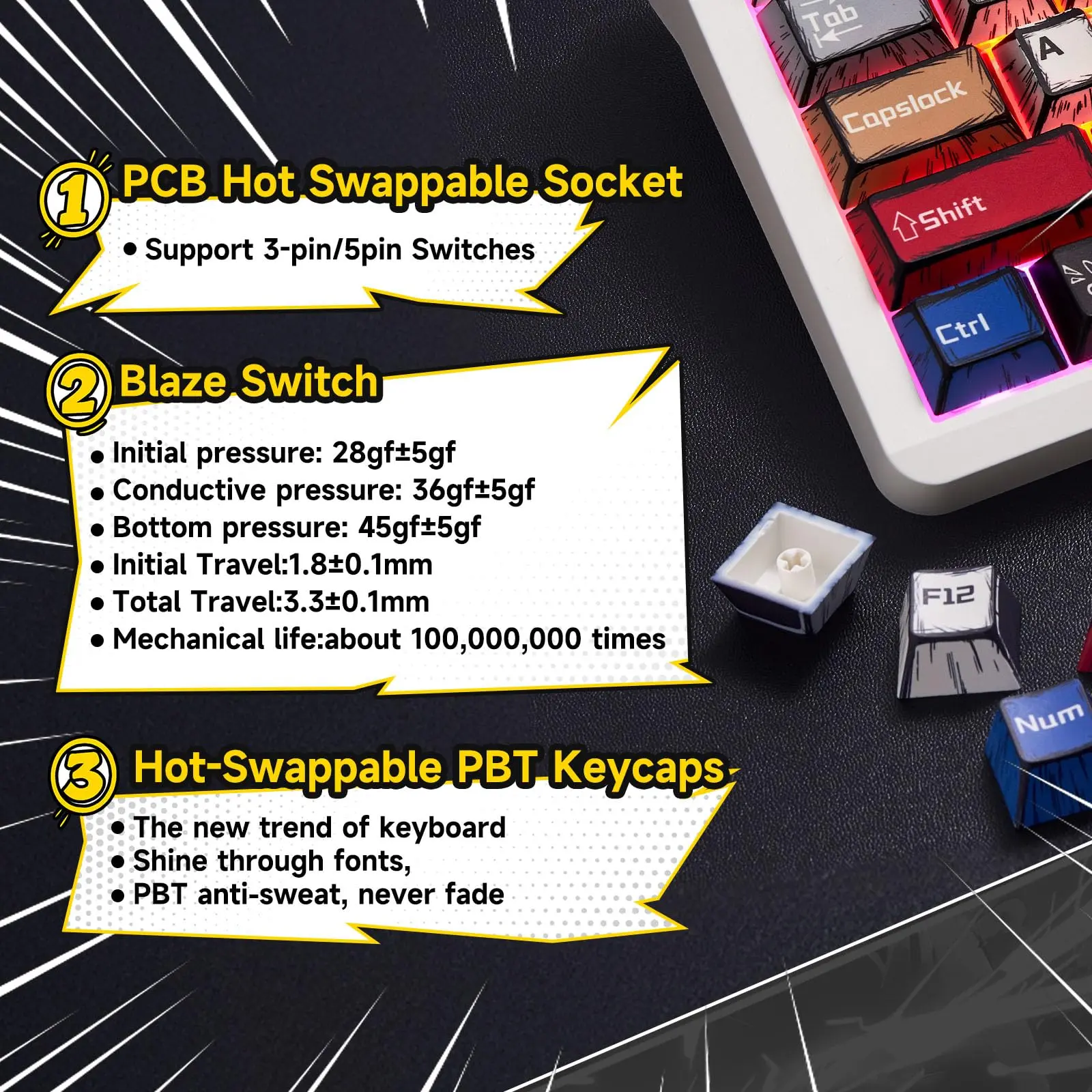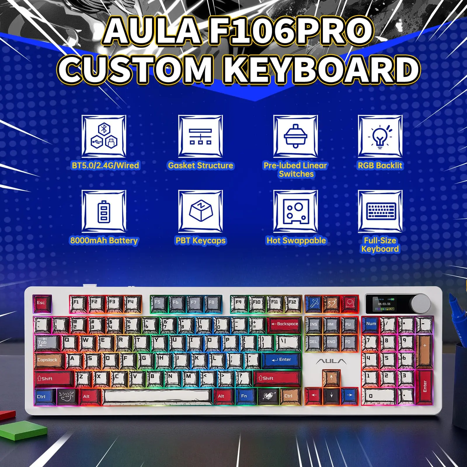 ·Hot-swappable Custom Keyboard: The Aula F106pro Creamy keyboard with Blaze Switch, switches and keycaps can be freely replaced .This customizable keyboard with hot-swap PCB allows users to replace 3 pins or 5 pins switches easily without soldering issue.(4 switchs/switch puller is included in the package). Equipped with pre-lubricated stabilizers and switches, the creamy keyboard bring smooth typing feeling and pleasant creamy mechanical sound.