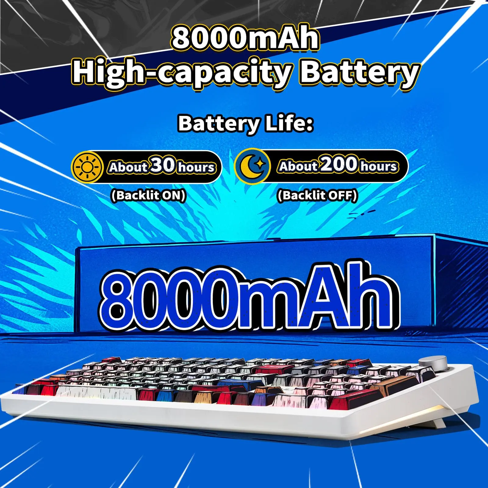 The large battery capacity increases the battery life in wireless mode. Please note that don't use a fast charging cable to charge this keyboard.