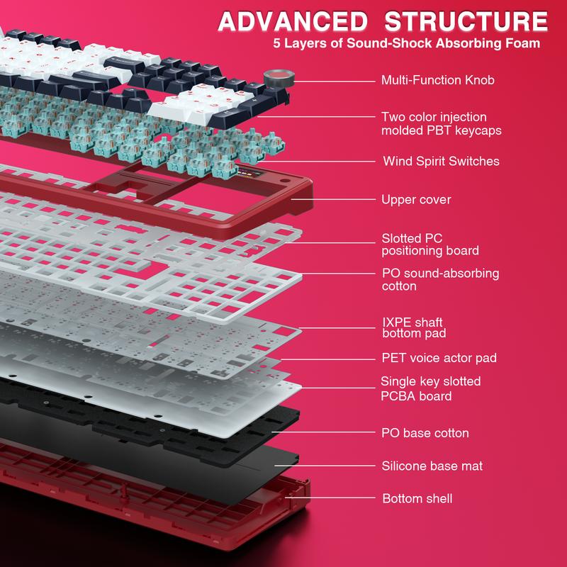 This keyboard is genuinely the best keyboard. It sounds so nice and it comes with different light modes and colors. You can just do a lot with customizing. You are able to customize the key caps and switches the box includes extra switches, a cord, and a tool for key caps n switches Material: Amazing.
