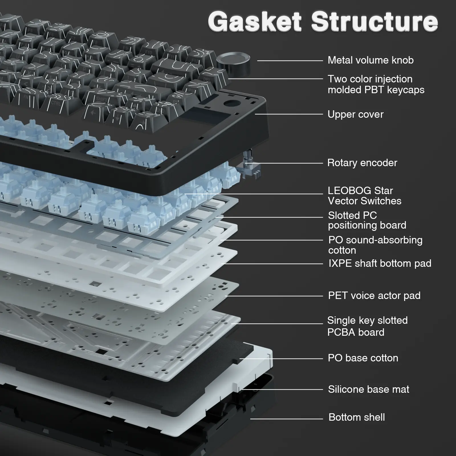 ·Gasket Structure and PCB Single Key Slotting: This thocky heavy mechanical keyboard features a gasket structure, extended integrated silicone pad, and PCB single key slotting, better optimizes resilience and stability, making the hand feel softer and more elastic. Five layers of filling silencer fills the gap between the PCB, the positioning plate and the shaft,effectively counteracting the cavity noise sound of the shaft hitting the positioning plate, and providing a solid feel