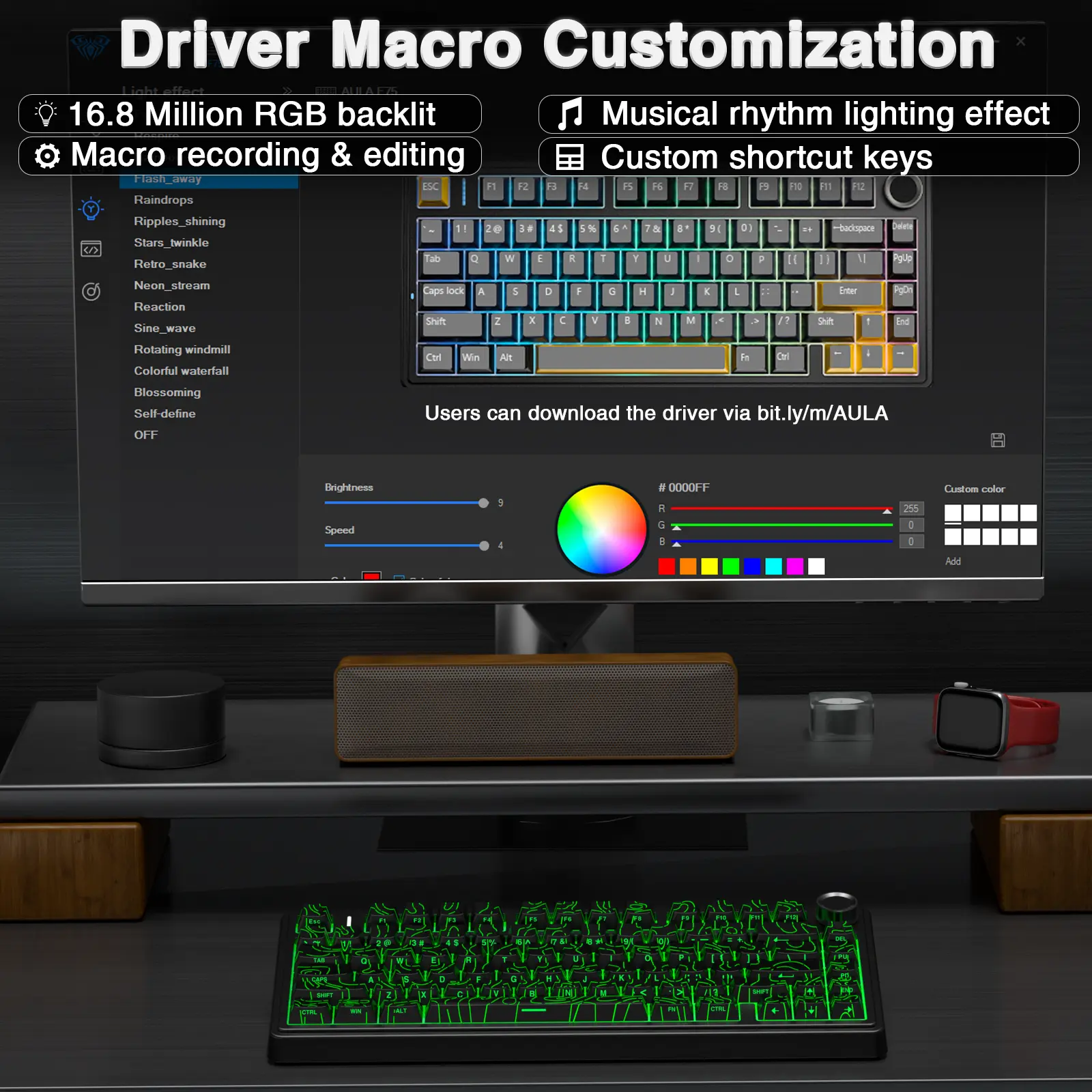 ·16.8 Million RGB Backlit: F75 Pro light up led keyboard features 16.8 million RGB lighting color. With 16 pre-set lighting effects to add a great atmosphere to the game. And supports 10 cool music rhythm lighting effects with driver. Lighting brightness and speed can be adjusted by the knob or the FN + key combination. You can select the single color effect as wish. And you can turn off the backlight if you do not need it