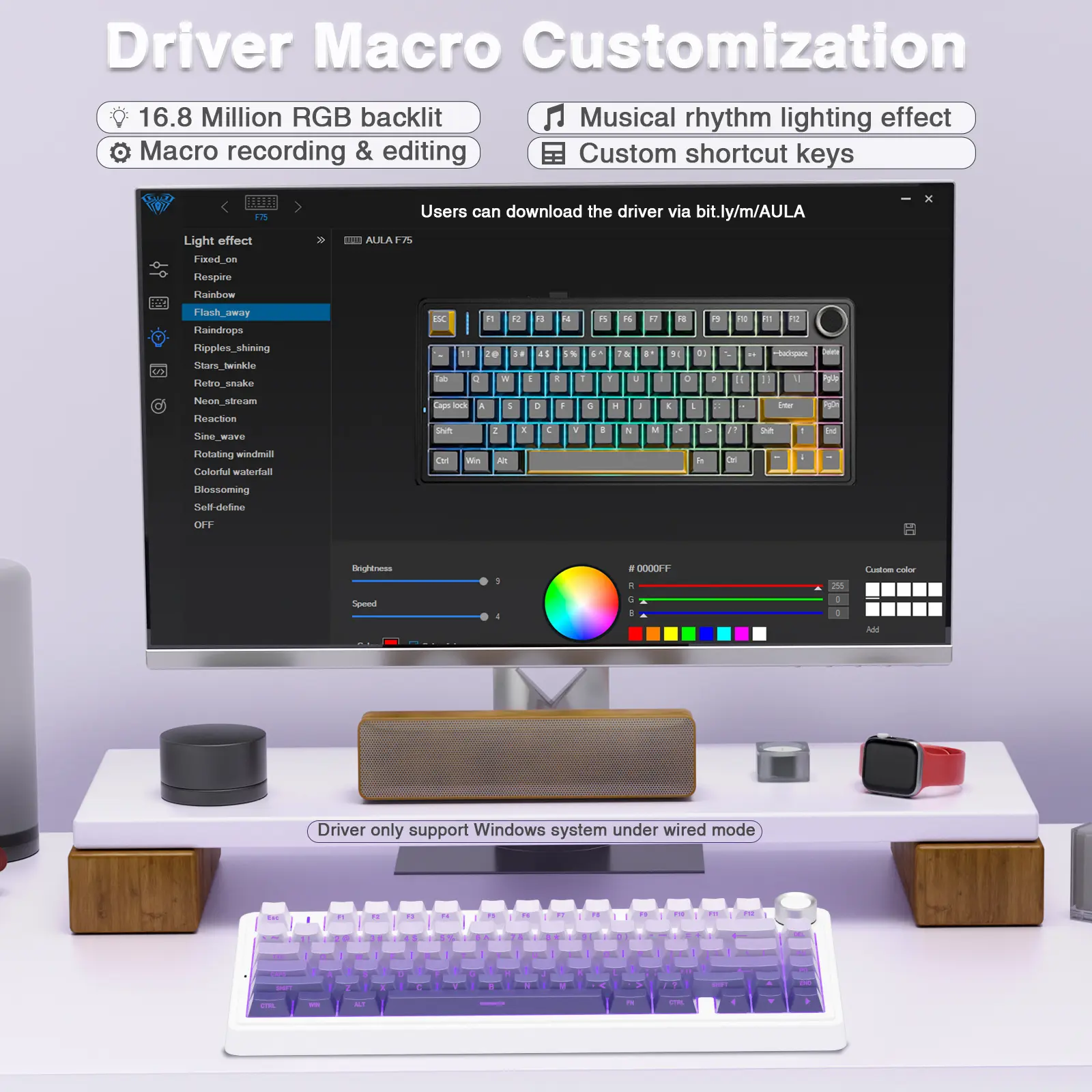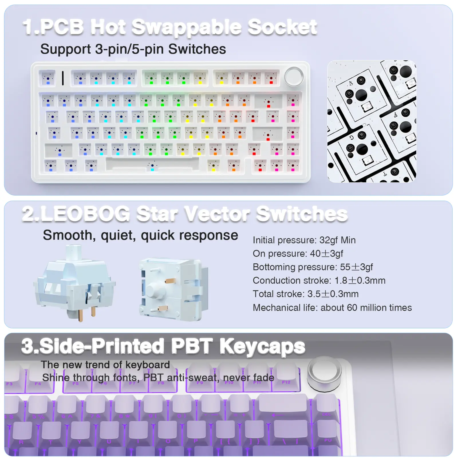 ·Hot-swap Custom Keyboard: This custom mechanical keyboard with hot-swappable base supports 3-pin or 5-pin switches replacement. Even keyboard beginners can easily DIY there own keyboards without soldering issue. F75 Pro gaming keyboards equipped with pre-lubricated stabilizers and LEOBOG star vector switches, bring smooth typing feeling and pleasant creamy mechanical sound, provide fast response for exciting game