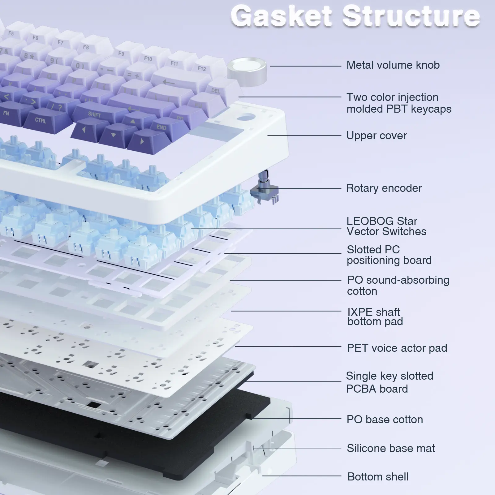 ·Gasket Structure and PCB Single Key Slotting: This thocky heavy mechanical keyboard features a gasket structure, extended integrated silicone pad, and PCB single key slotting, better optimizes resilience and stability, making the hand feel softer and more elastic. Five layers of filling silencer fills the gap between the PCB, the positioning plate and the shaft,effectively counteracting the cavity noise sound of the shaft hitting the positioning plate, and providing a solid feel