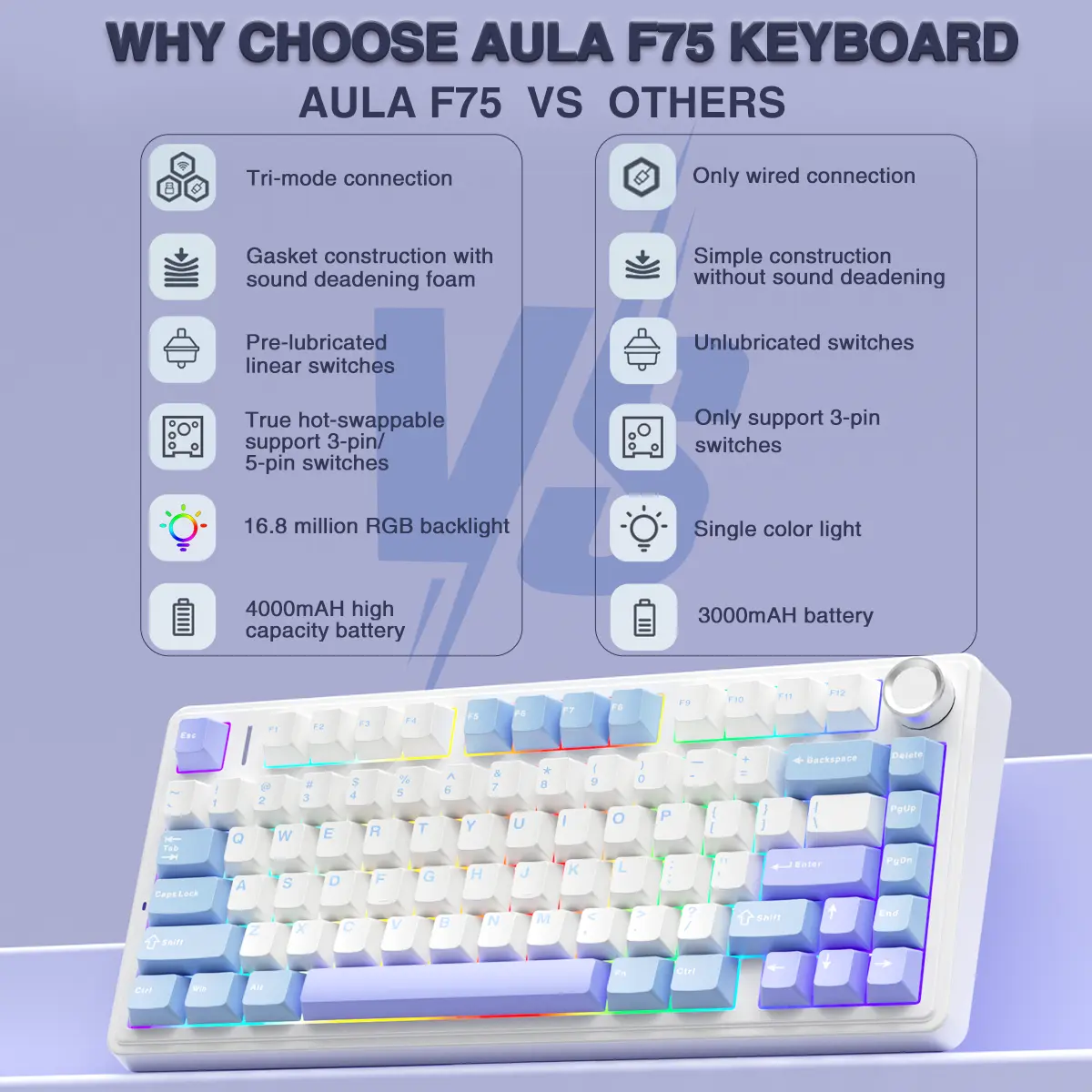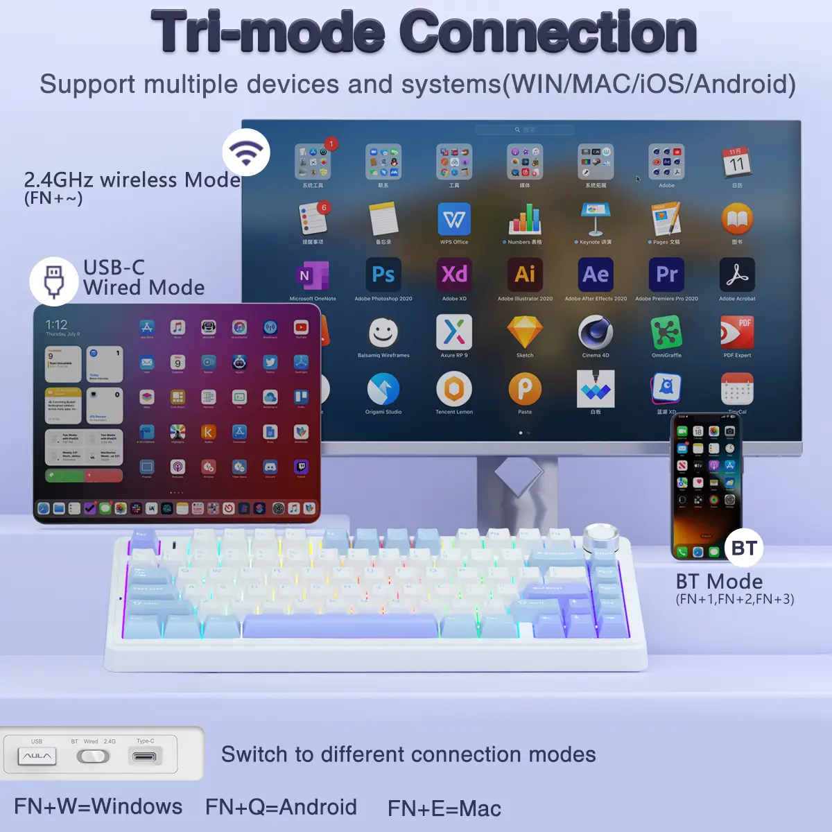 ·Tri-mode Connection Keyboard: AULA F75 wireless mechanical keyboard supports BT5.0, 2.4GHz wireless and USB wired connection, can connect up to five devices at the same time, and easily switch by shortcut keys or side button. F75 computer keyboard is suitable for PC, laptops, tablets, mobile phones, PS, XBOX etc, to meet all the needs of users. In addition, the rechargeable keyboard is equipped with a 4000mAh large-capacity battery, which has long-lasting battery life