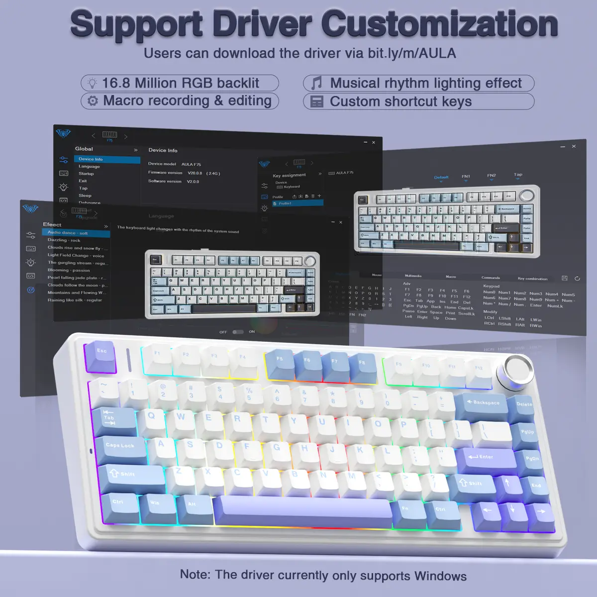 ·Professional Gaming Keyboard: No matter the outlook, the construction, or the function, F75 mechanical keyboard is definitely a professional gaming keyboard. This 81-key 75% layout compact keyboard can save more desktop space while retaining the necessary arrow keys for gaming. Additionally, with the multi-function knob, you can easily control the backlight and Media. Full-key macro programmable, you can customize the function of single key or key combination function through F75 driver to increase the probability of winning the game and improve the work efficiency. N key rollover, and supports WIN key lock to prevent accidental touches in intense games