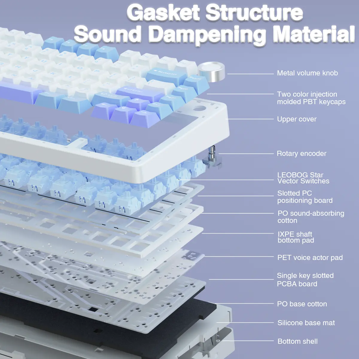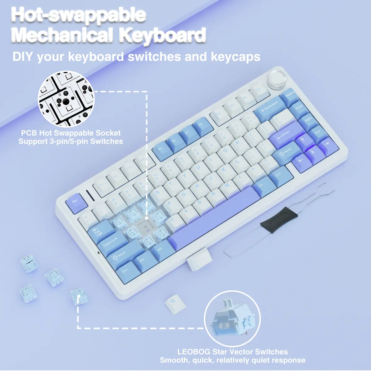·Hot-swap Custom Keyboard: This custom mechanical keyboard with hot-swappable base supports 3-pin or 5-pin switches replacement. Even keyboard beginners can easily DIY there own keyboards without soldering issue. F75 gaming keyboards equipped with pre-lubricated stabilizers and LEOBOG star vector switches, bring smooth typing feeling and pleasant creamy mechanical sound, provide fast response for exciting game
