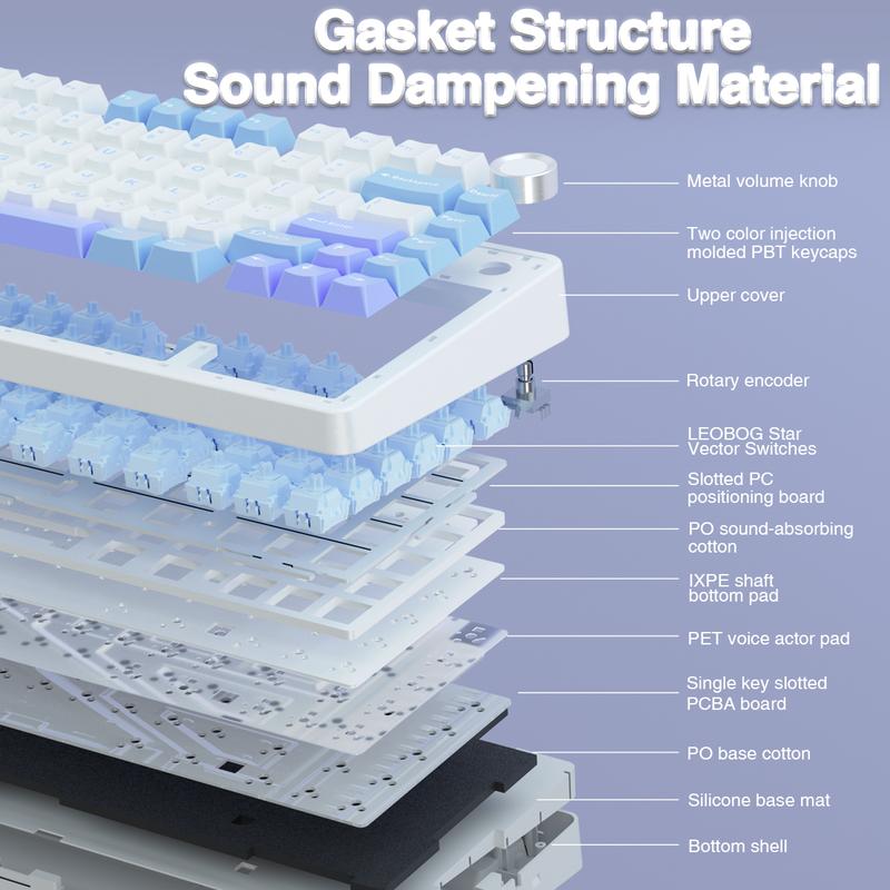 ·Gasket Structure & PCB Single Key Slotting: This thocky heavy mechanical keyboard features a gasket structure, extended integrated silicone pad, and PCB single key slotting, better optimizes resilience and stability, making the hand feel softer and more elastic. Five layers of filling silencer fills the gap between the PCB, the positioning plate and the shaft,effectively counteracting the cavity noise sound of the shaft hitting the positioning plate, and providing a solid feel