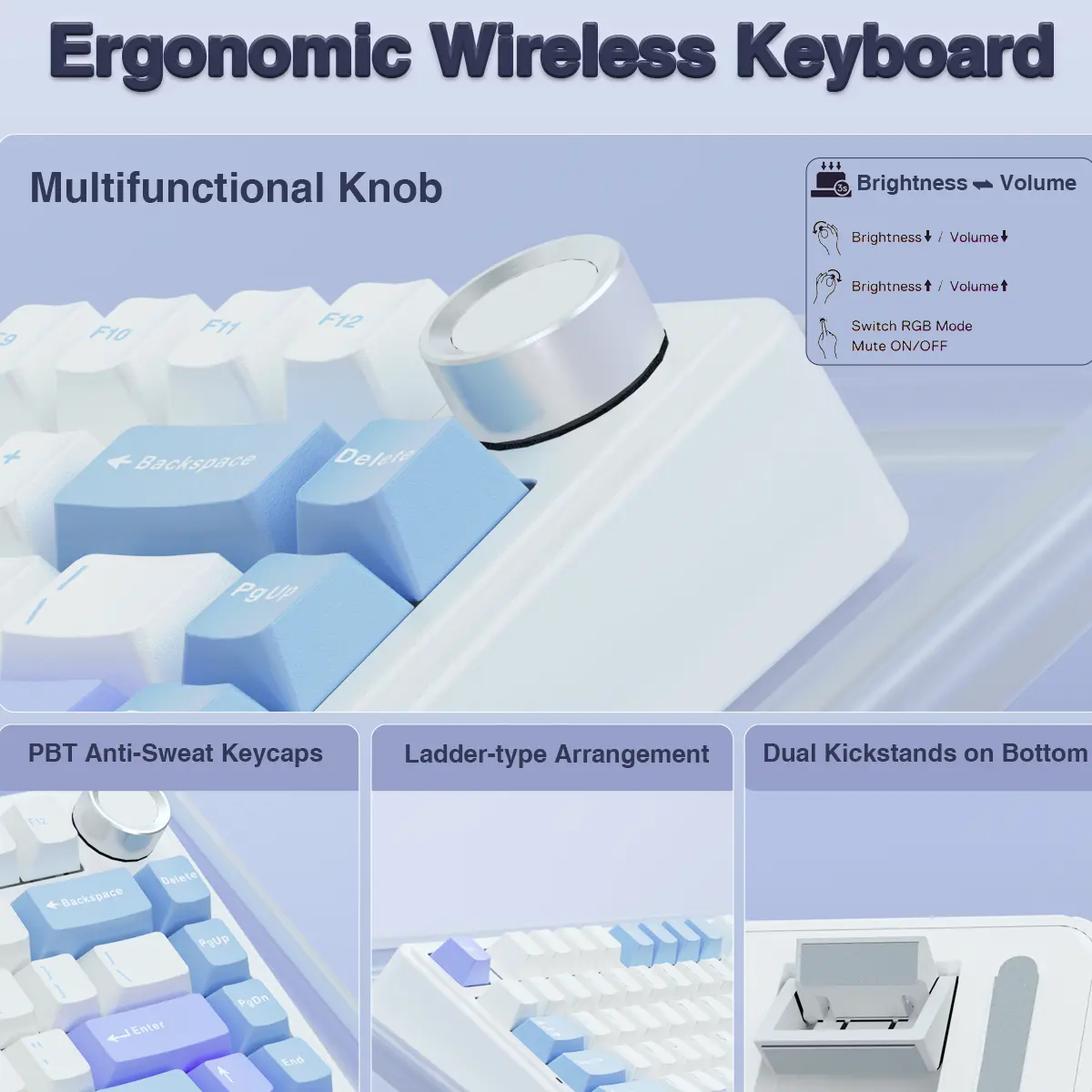 ·Multi-function Control Knob: This AULA 75% wireless gaming keyboard is equipped with functional knob to switch gaming mode or office mode. In gaming mode, you can rotate the knob to adjust the brightness of the lights, and click the knob to switch the lighting effects easily; in office mode, rotate the knob to adjust the volume, and click the knob to play or pause. Long press the knob for about 5 seconds to switch modes