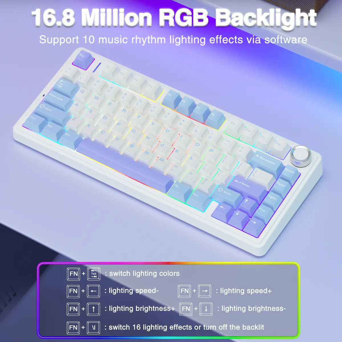 ·16.8 Million RGB Backlit: F75 light up led keyboard features 16.8 million RGB lighting color. With 16 lighting effects to add a great atmosphere to the game. And supports 10 cool music rhythm lighting effects with driver. Lighting brightness and speed can be adjusted by the knob or the FN and key combination. You can select the single color effect as wish. And if you can turn the backlight off if you do not need it
