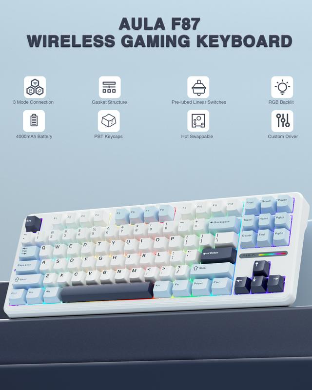 ·RGB Keyboard & Music Rhythm Lighting Effect: AULA F87 computer keyboard comes with 15 stunning rgb lighting effects, over 16.8 million rgb colors that can be customized through the driver, and rgb light bands on both sides of the backlit keyboard to add a stronger gaming atmosphere. What's more, the wireless mechanical keyboard features 10 unique music rhythm lighting effects that change with the melodic beat of the music, pulling in a full sense of ambience