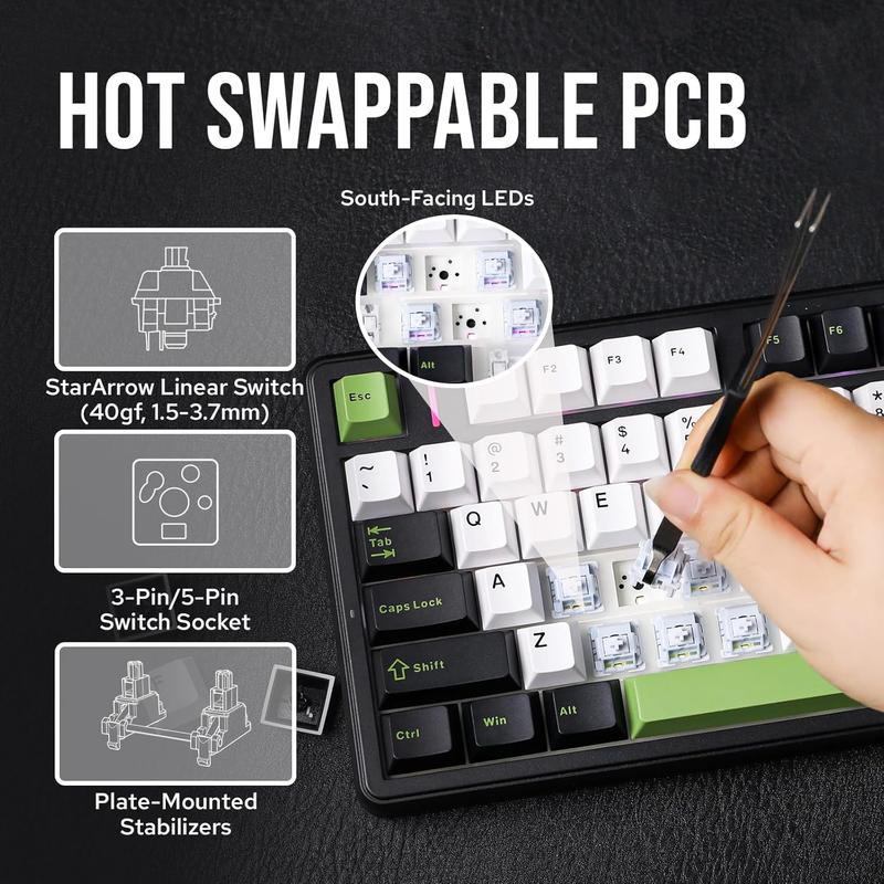 Enjoy the satisfying typing sound with F99 PRO's lubed linear switches. We recommend switches with light force and short travel for gamers and speed seekers; while switches with heavier force and longer travel are better for office and typing accuracy.