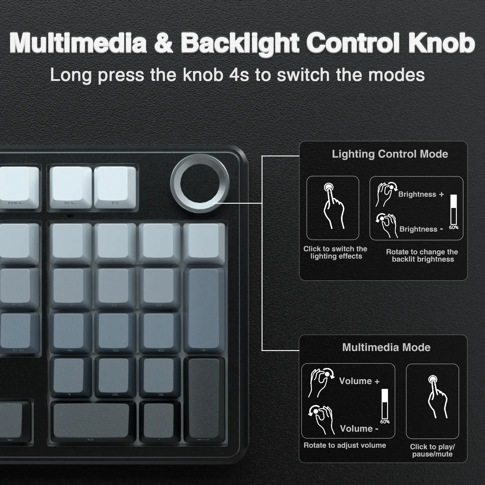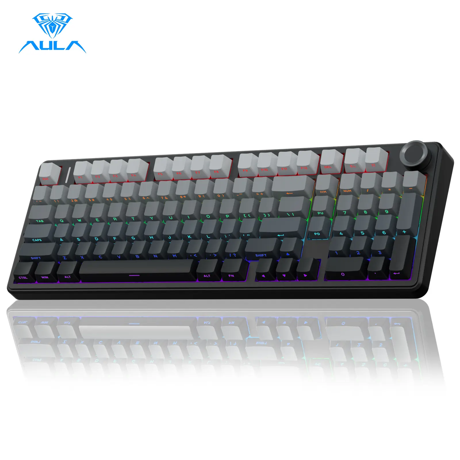·Multi-function Control Knob: This AULA 96% wireless gaming keyboard is equipped with functional knob to switch backlit mode or multimedia mode. In backlit mode, you can rotate the knob to adjust the brightness of the lights, and click the knob to switch the lighting effects easily; in multimedia mode, rotate the knob to adjust the volume, and click the knob to play or pause. Long press the knob for about 5 seconds to switch modes