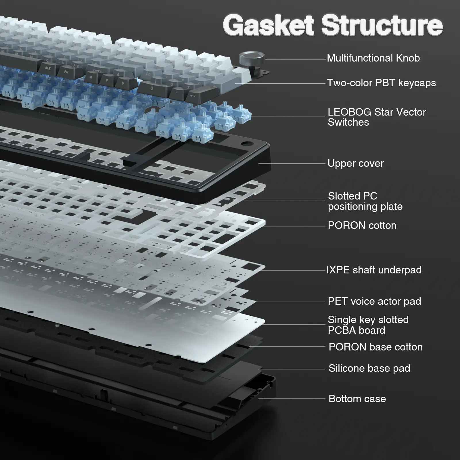 ·Gasket Structure and PCB Single Key Slotting: This computer keyboard features a gasket structure, extended integrated silicone pad, and PCB single key slotting, better optimizes resilience and stability, making the hand feel softer and more elastic. Five layers of filling silencer fills the gap between the PCB, the positioning plate and the shaft,effectively counteracting the cavity noise sound of the shaft hitting the positioning plate, and providing a solid feel