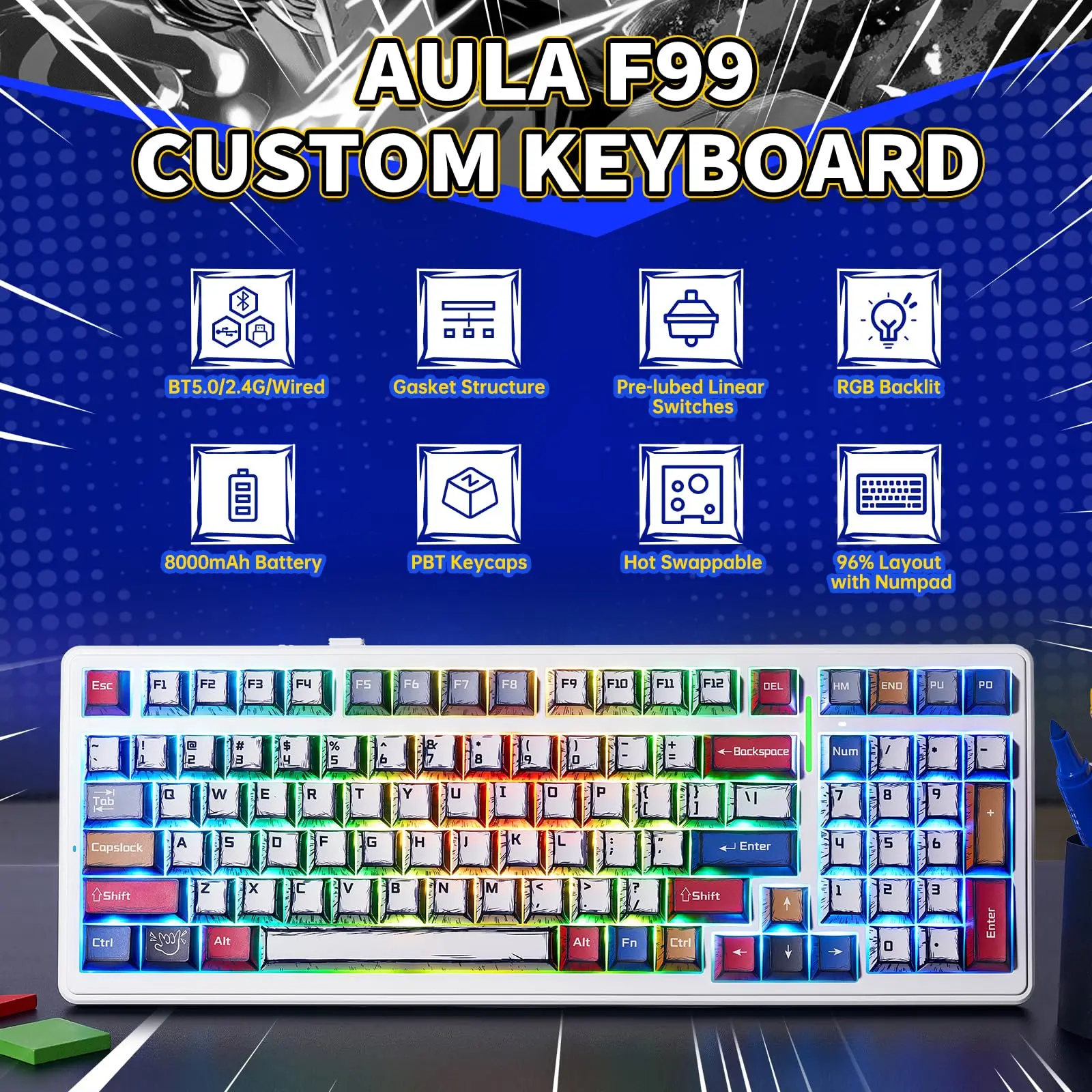 99-key streamlined layout,can save more space on the desk, and keep the arrow keys and numpad which are necessary for gaming and work.Aula F99 mechanical gaming keyboard is fully programmable, with key mapping, macro definitions, sleep time, on-screen Gif images, and RGB lighting effects.