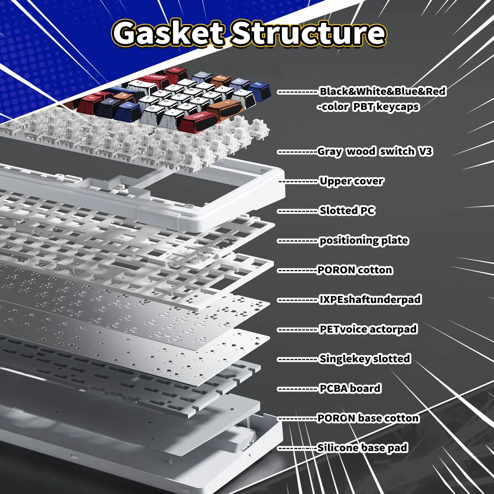 This thocky heavy mechanical keyboard features a gasket structure, extended integrated silicone pad, and PCB single key slotting, better optimizes resilience and stability, making the hand feel softer and more elastic.