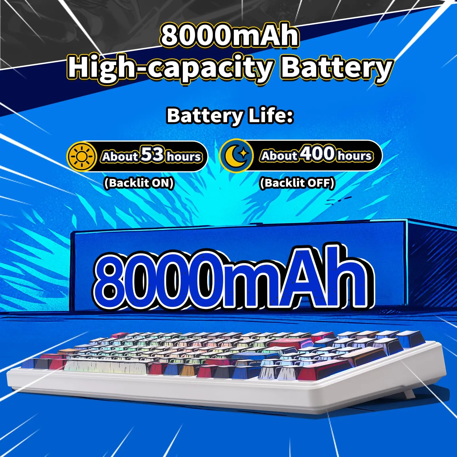 Double-shot PBT keycaps with vibrant comic-style print that won’t fade. Built-in 8000mAh battery offers ultra-long standby for non-stop work and play.