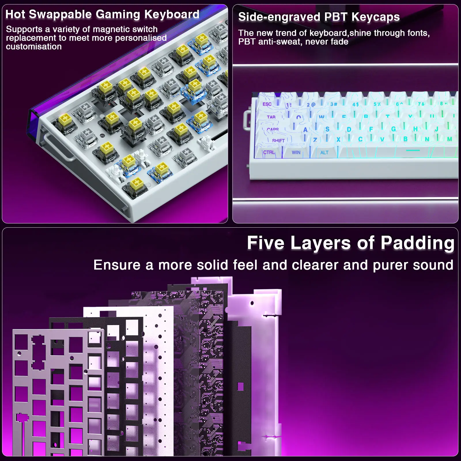 ·Side-Printed PBT Keycaps: Side-printed keycap keyboard are currently a new trend worldwide. These side-engraved PBT keycaps take double injection molding and heat sublimation process, which are more durable without fading, sweat-proof, and softer to the touch, allow the keyboard's light to shine through fonts. Compared with traditional keyboard, this pc gaming keyboard can bring you a very different keyboard using experience.