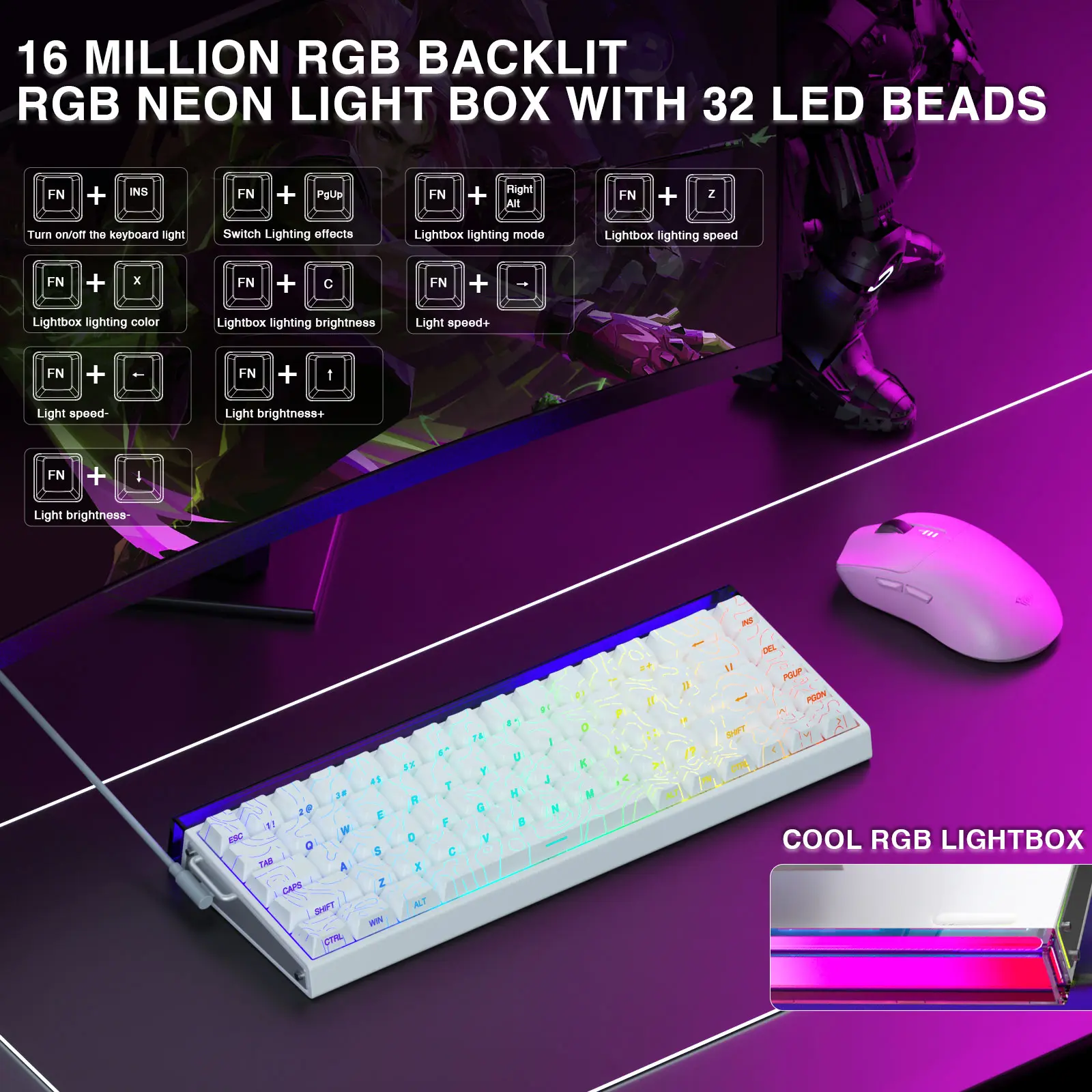 ·Personalized Lightbox Design & RGB Backlit: The neon lightbox design with 32 LEDs on the front side is so cool and gives you an immersive gaming experience. The light up keyboard features 16.8 million colors of rgb lighting effects with south-facing LEDs for a better visual experience. 20 lighting effects add a great ambience to games. Lighting effects and brightness can be easily adjusted via driver or FN and key combinations. The backlight can be turned off if not needed