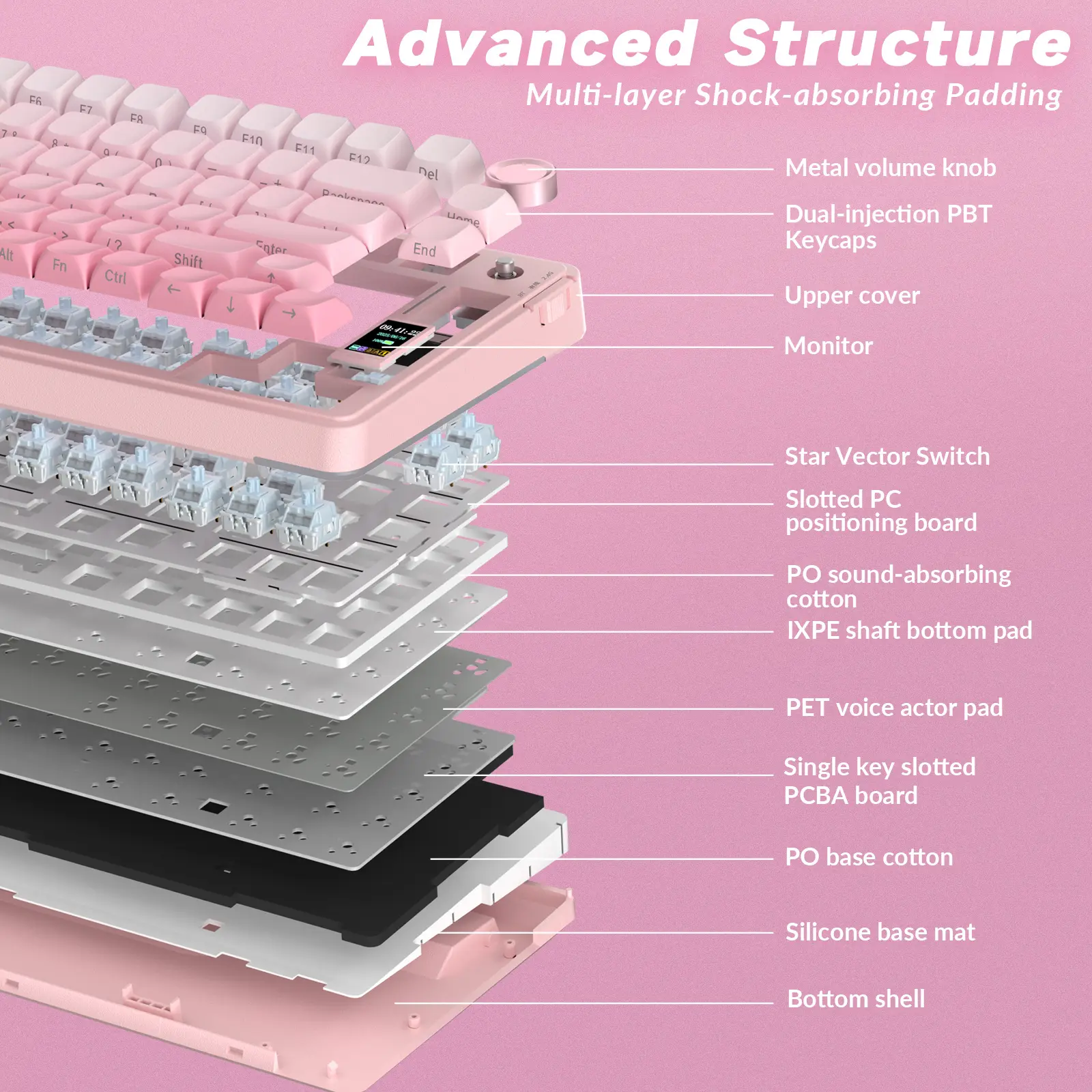 ·Creamy Keyboard with Advanced Structure: The S75 Pro thocky keyboard features an advanced structure, extended integrated silicone pad, and PCB single key slotting, better optimizes resilience and stability, making the hand feel softer and more elastic. Five layers of filling silencer fills the gap between the PCB, the positioning plate and the shaft, effectively counteracting the cavity noise sound of the shaft hitting the positioning plate, and providing a solid feel