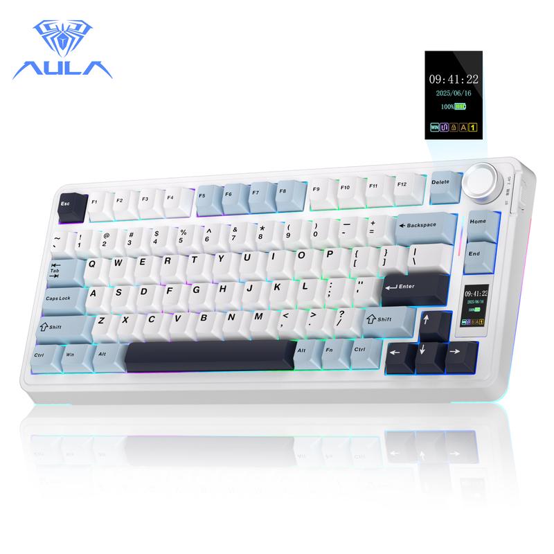 ·Customizable Screen & Multi-function Knob: Stylish AULA S75 Pro wireless mechanical keyboard comes with a LCD screen, serving as the interactive interface for real-time updating and customization. Through the screen, you can see all its functions at a glance, such as battery status, date and time, operating system, Gif images, volume and backlight effect. Combined with the multi-function knob, you can quickly customize most of the keyboard's functions.(Note: You need to download the software under windows system and keep in wired mode to set the screen image/GIF, calibrate the date and time.Fn key + press the knob to switch screen control)