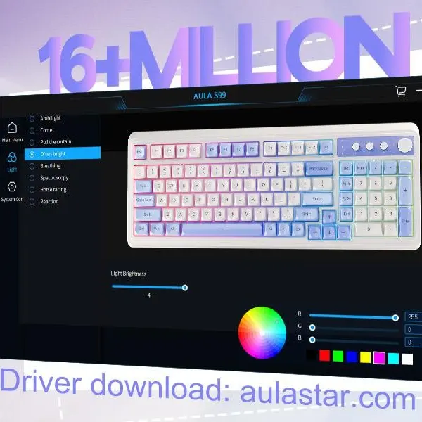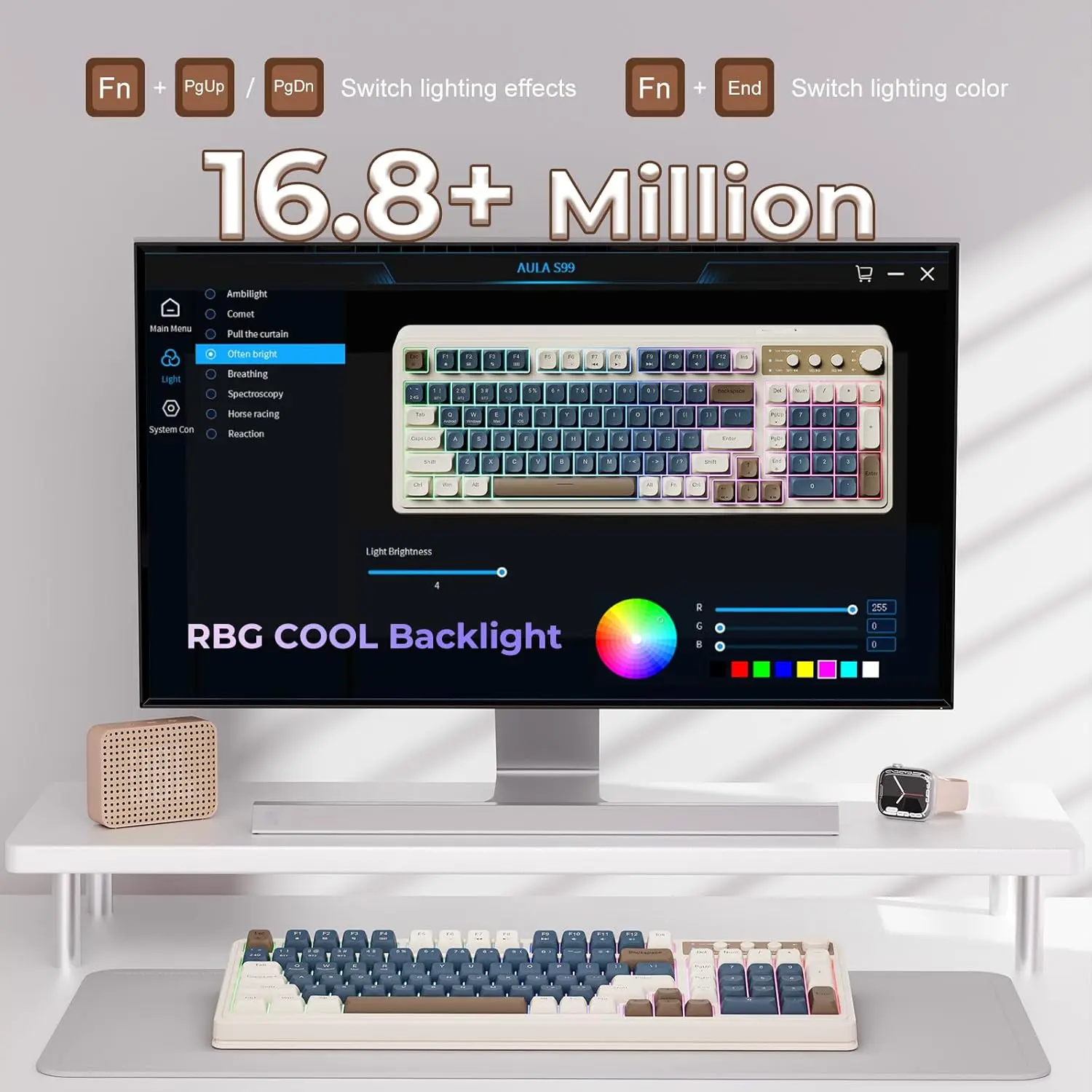 ·Customizable Macros: All keys on the AULA S99 are fully customizable. Record and program macros to execute complex actions with a single keystroke, ideal for real-time gaming. You can also use the dual-mode rotary knob to adjust volume, audio, and lighting effects with ease, adding a personal touch to your gaming setup.