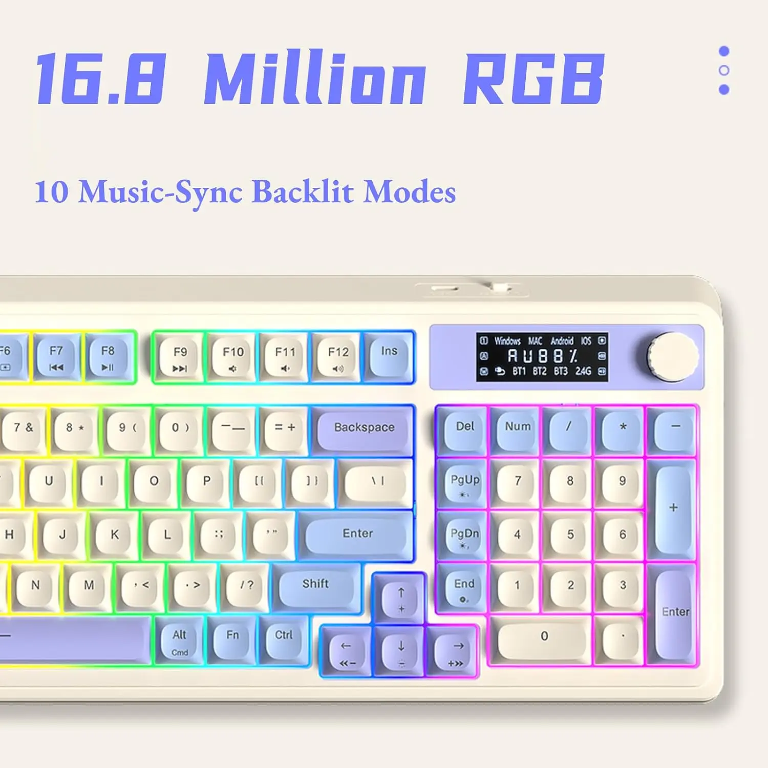 ·Custom Keyboard: All keys on this wireless keyboard support macro customization, which allows you to record and edit macros to program a series of complex actions into a key, useful in very exciting real-time games. Bluetooth keyboard is equipped with dual-mode rotary knob for easy adjustment of volume, audio and lighting effects. Enjoy the fascination of technology and a new experience with the purple membrane keyboard