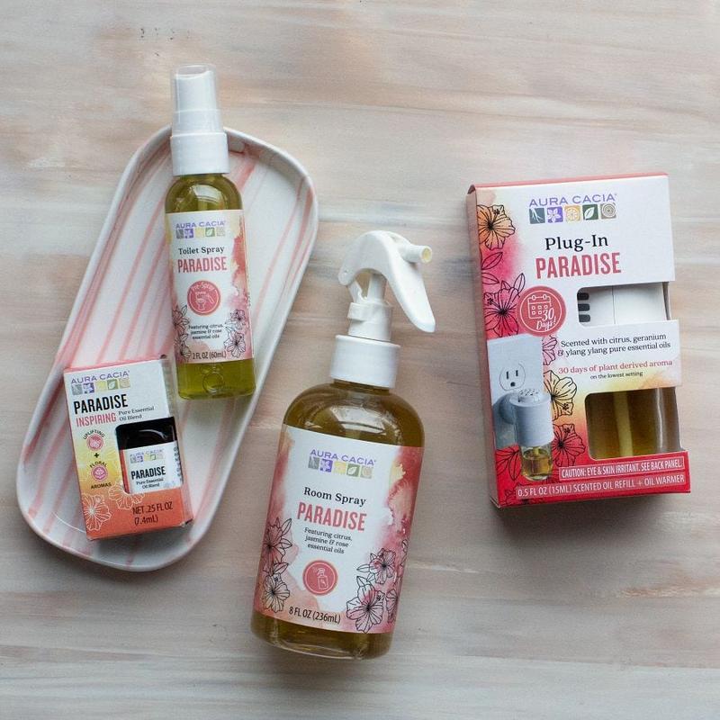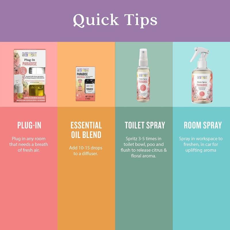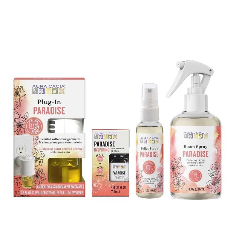 Includes Paradise Plug-In (0.5 fl oz), Paradise Room Spray (8 fl oz), Paradise Essential Oil Blend (0.25 fl oz), and Paradise Toilet Spray (2 fl oz).