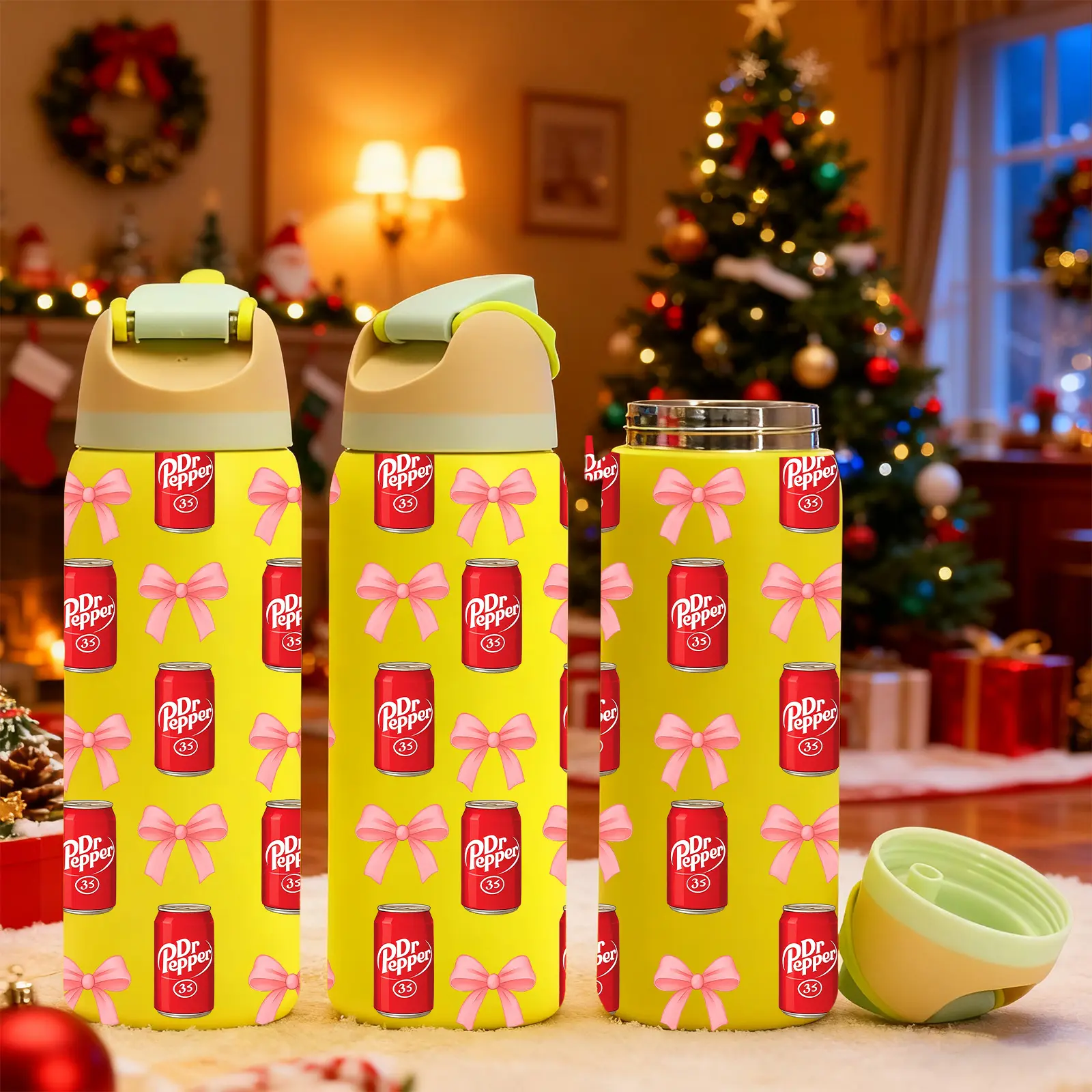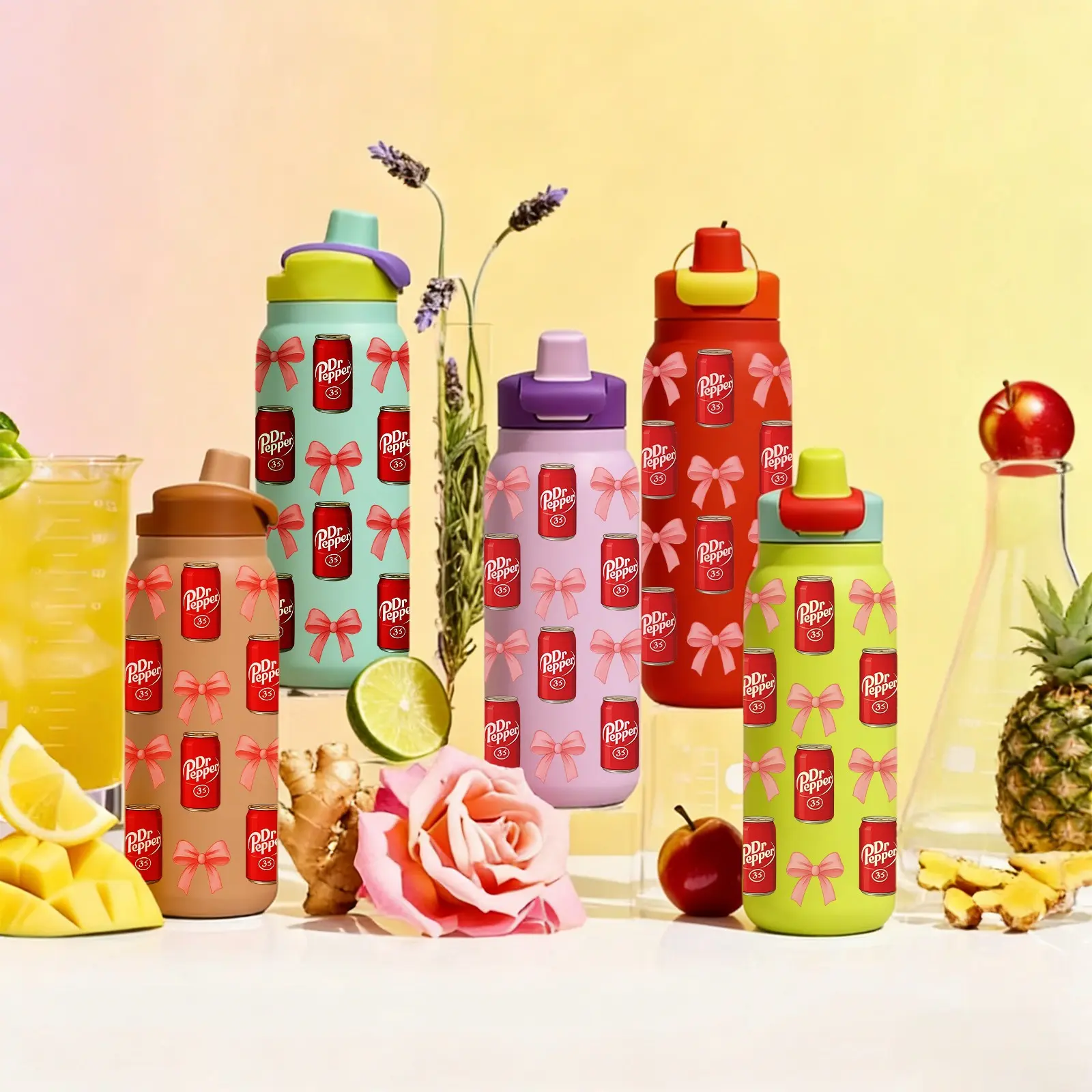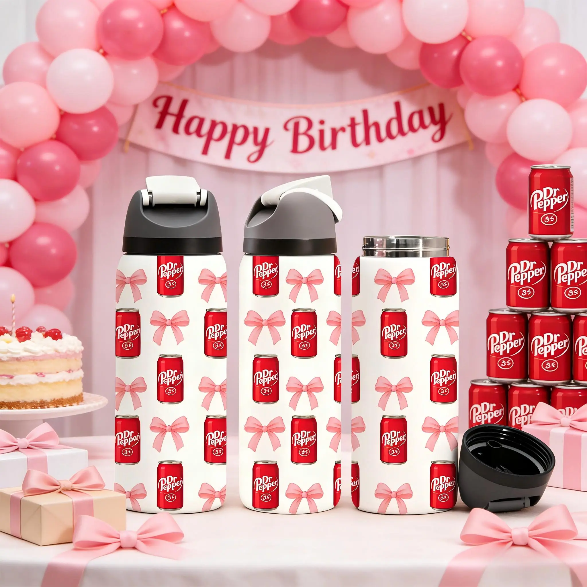 ăUnique Aestheticsă: Features a cute Dr Pepper soda can and pink bow pattern, adding a playful touch to beverage containers.