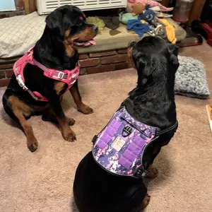Oh how i love the pattern on this purple camouflage harness. The material is of good sturdy quality. Very durable. I bought all different colors because they are so stylish! Made with good string material. And nice padding.
