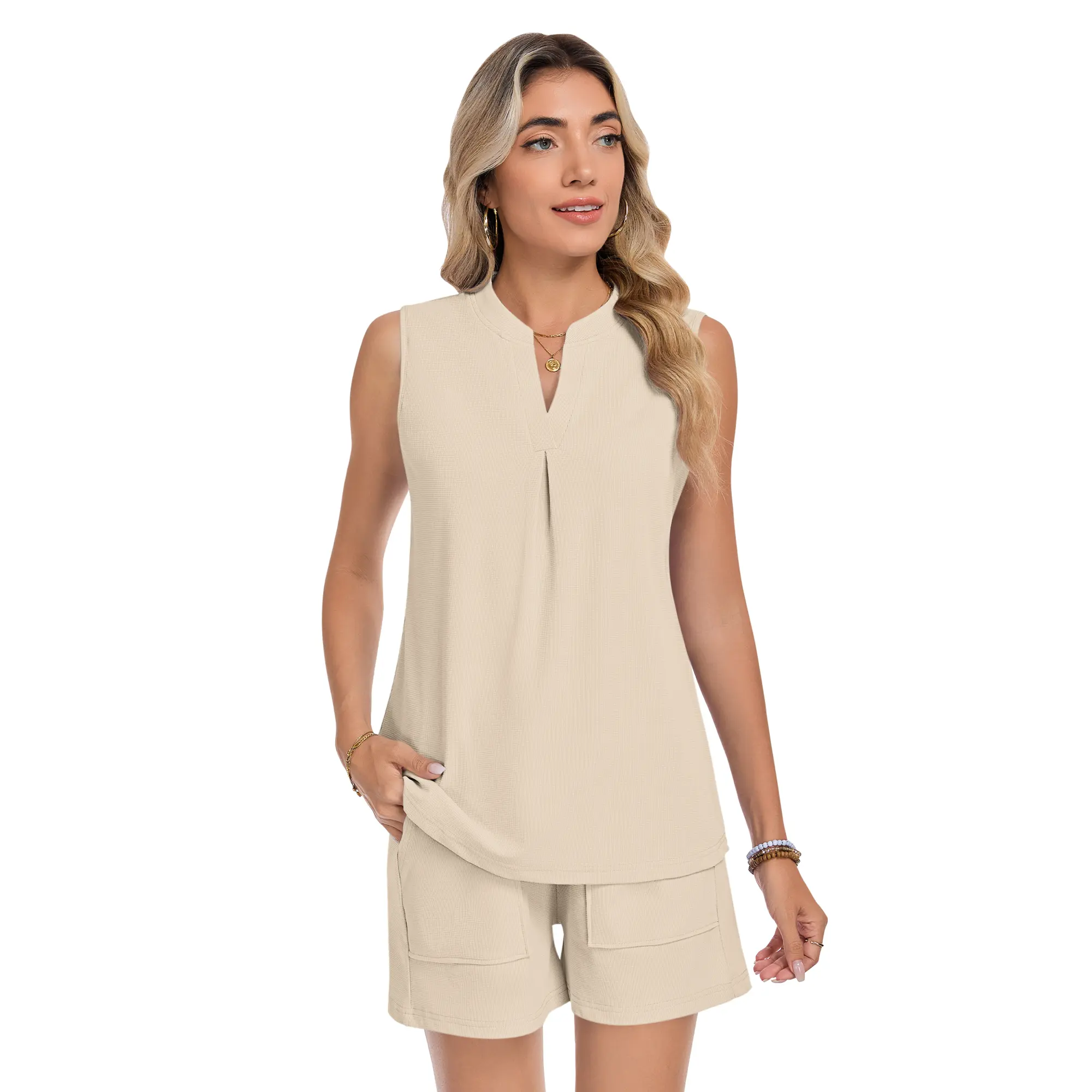 AUSELILY Women's Two Piece Sets Waffle Knit Summer V Neck Sleeveless Pleated Shorts Set Matching Sets Women Clothing 2026AUSELILY Women's Two Piece Sets Waffle Knit Summer V Neck Sleeveless Pleated Shorts Set Matching Sets Women Clothing 2026