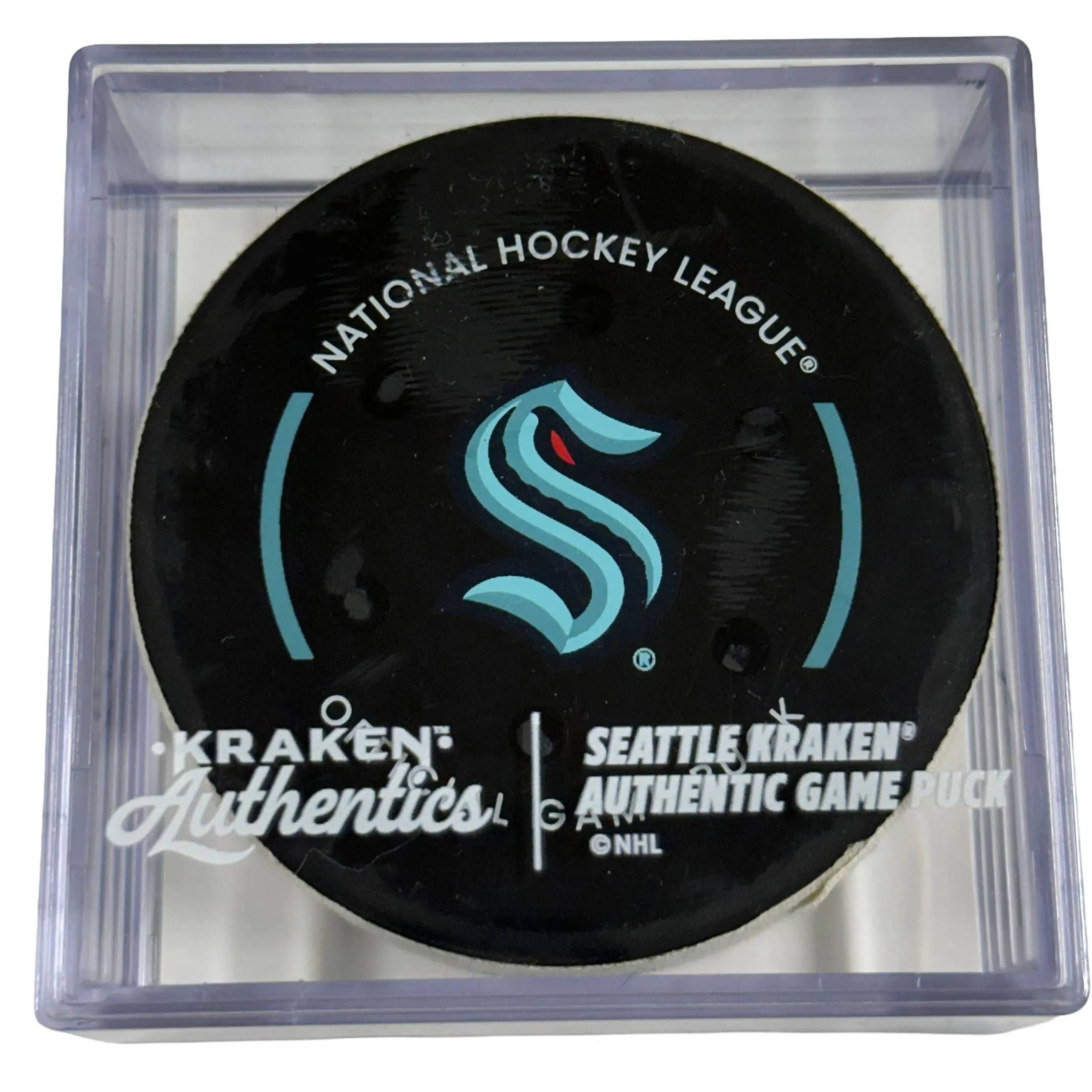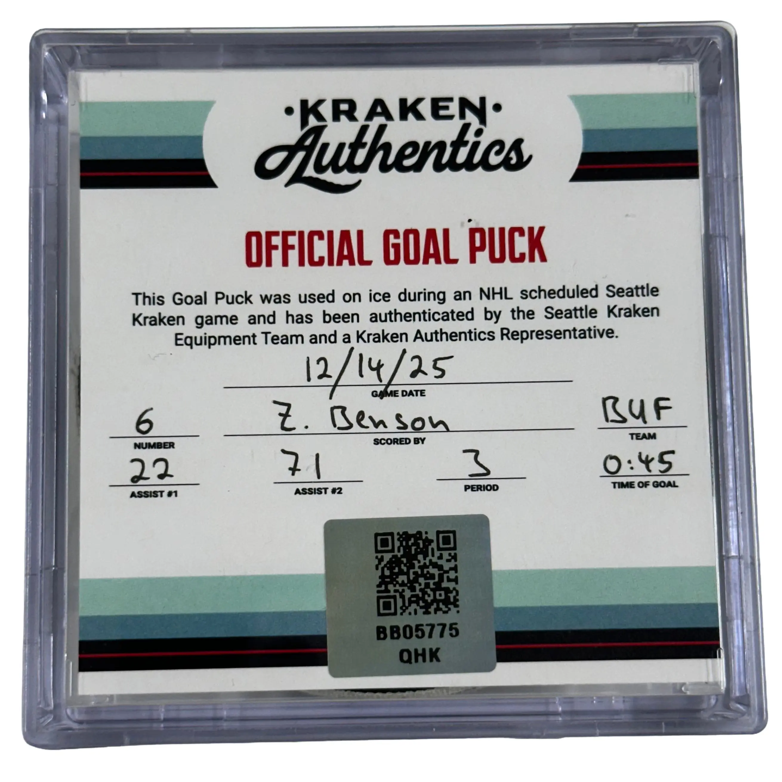 Official game-used goal puck from the Seattle Kraken vs. Buffalo Sabres game on December 14, 2025.