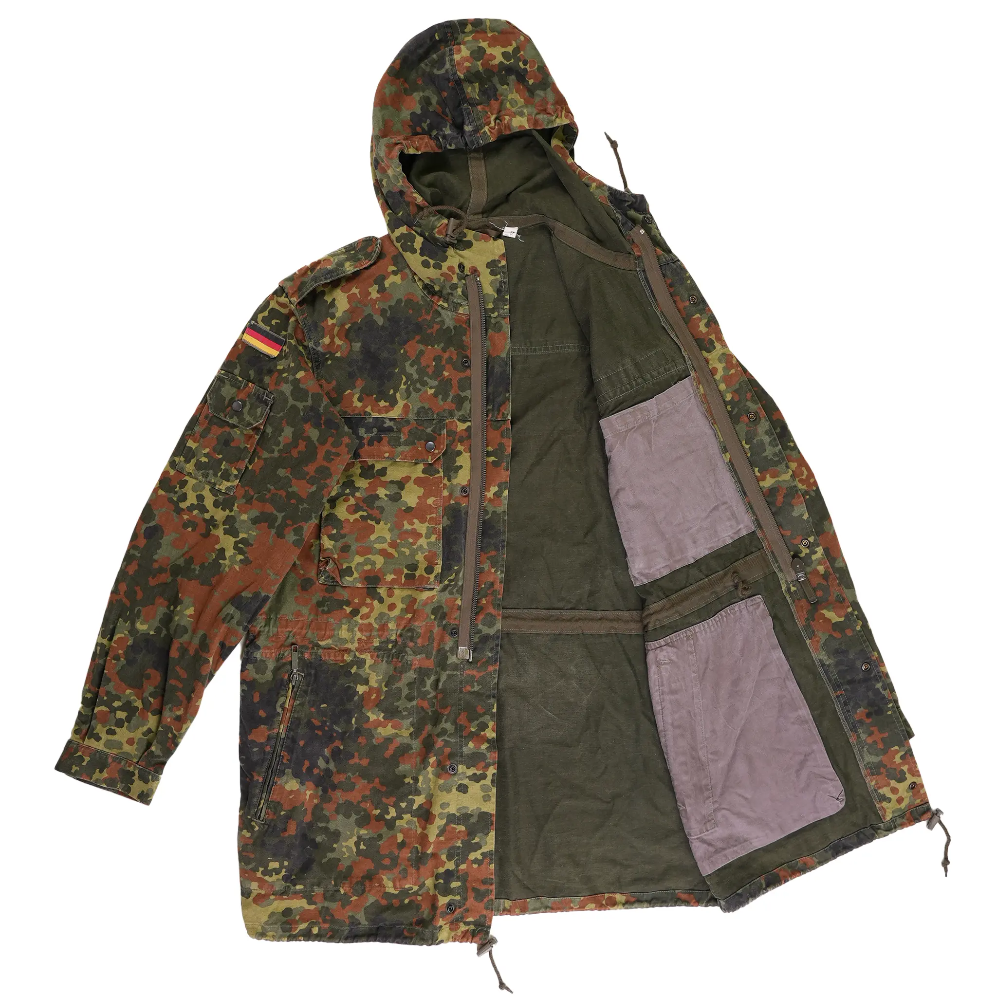 The German Flecktarn Parka, made from a blend of cotton and polyester, is a durable and practical piece of military surplus. It features a zippered front with a buttoned storm flap for added weather protection, along with multiple pockets for ample storage.